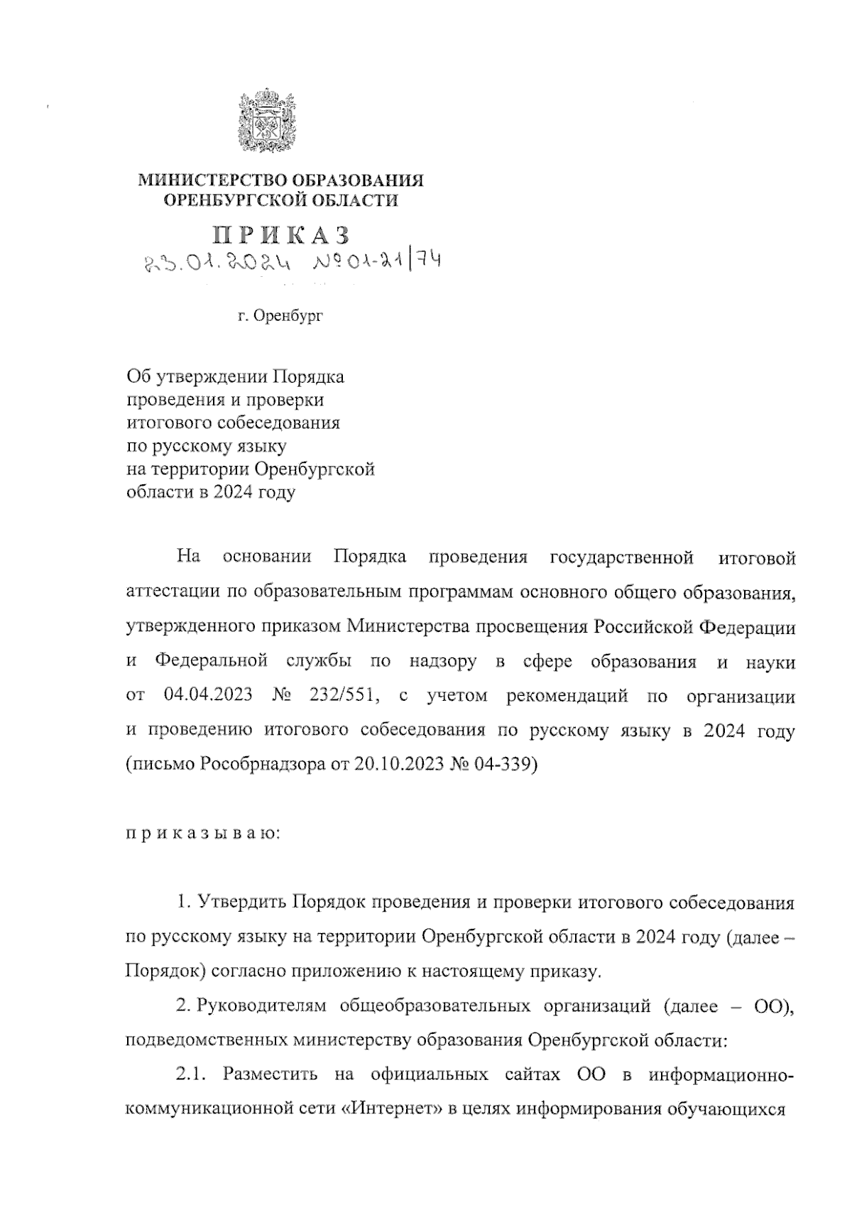 Приказ Министерства образования Оренбургской области от 23.01.2024 № 01-21/74
