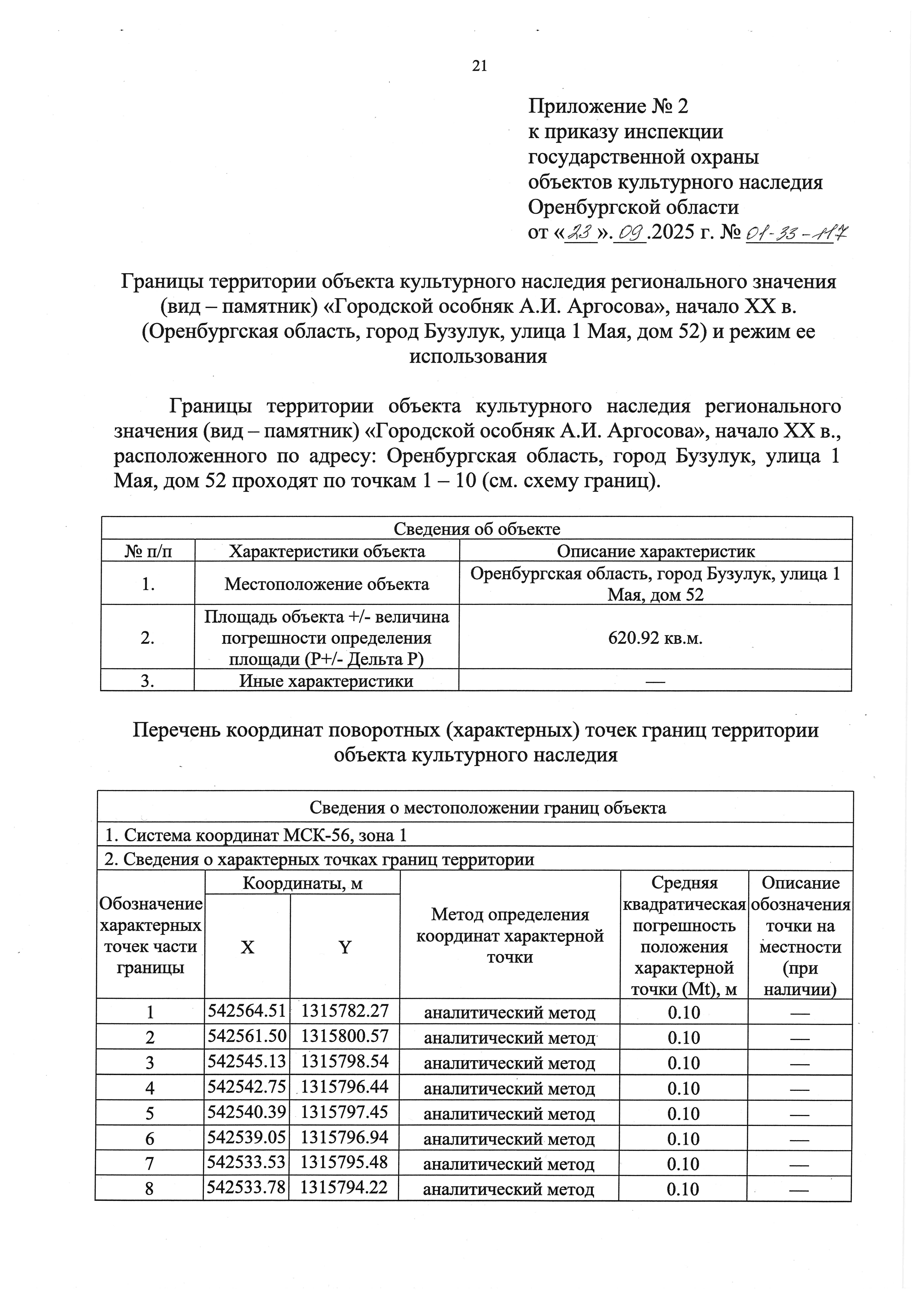 "О включении выявленного объекта культурного наследия в единый государственный реестр объектов культурного наследия (памятников истории и культуры) народов Российской Федерации в качестве объекта культурного наследия регионального значения (вид – памятник) "Городской особняк А.И. Аргосова", начало ХХ в. (Оренбургская область, город Бузулук, улица 1 Мая, дом 52), об утверждении предмета охраны, границ и режима использования территории объекта культурного наследия"