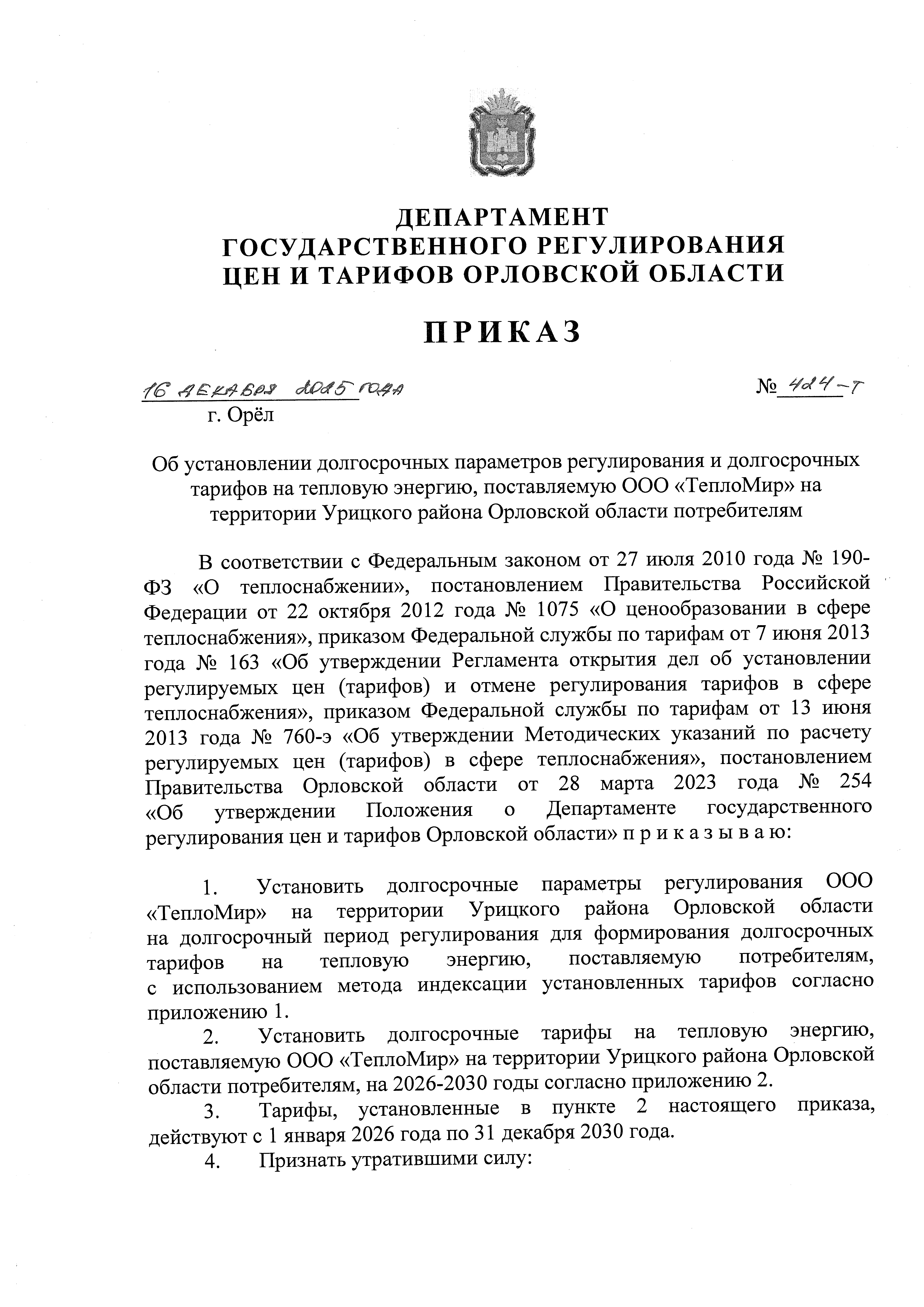 "Об установлении долгосрочных параметров регулирования и долгосрочных тарифов на тепловую энергию, поставляемую ООО "ТеплоМир" на территории Урицкого района Орловской области потребителям"