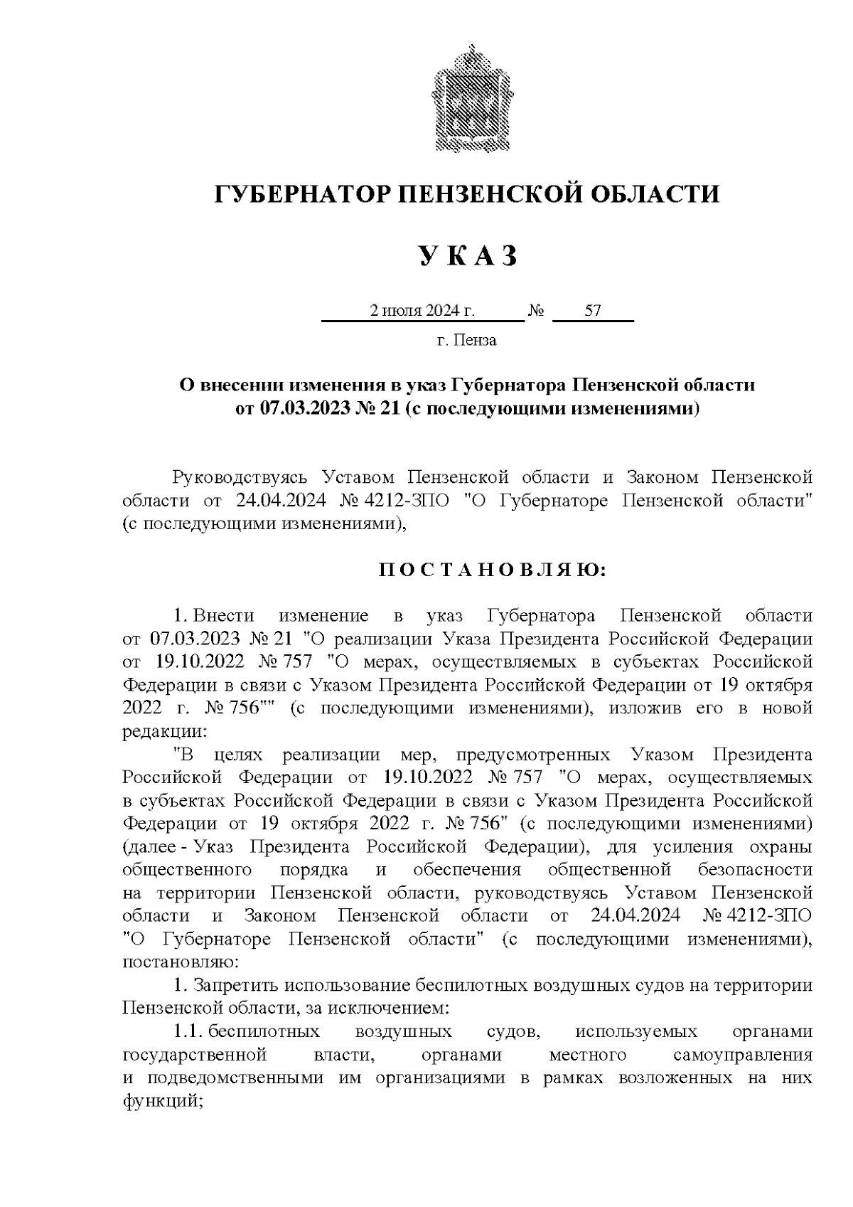 Указ Губернатора Пензенской области от 02.07.2024 № 57
