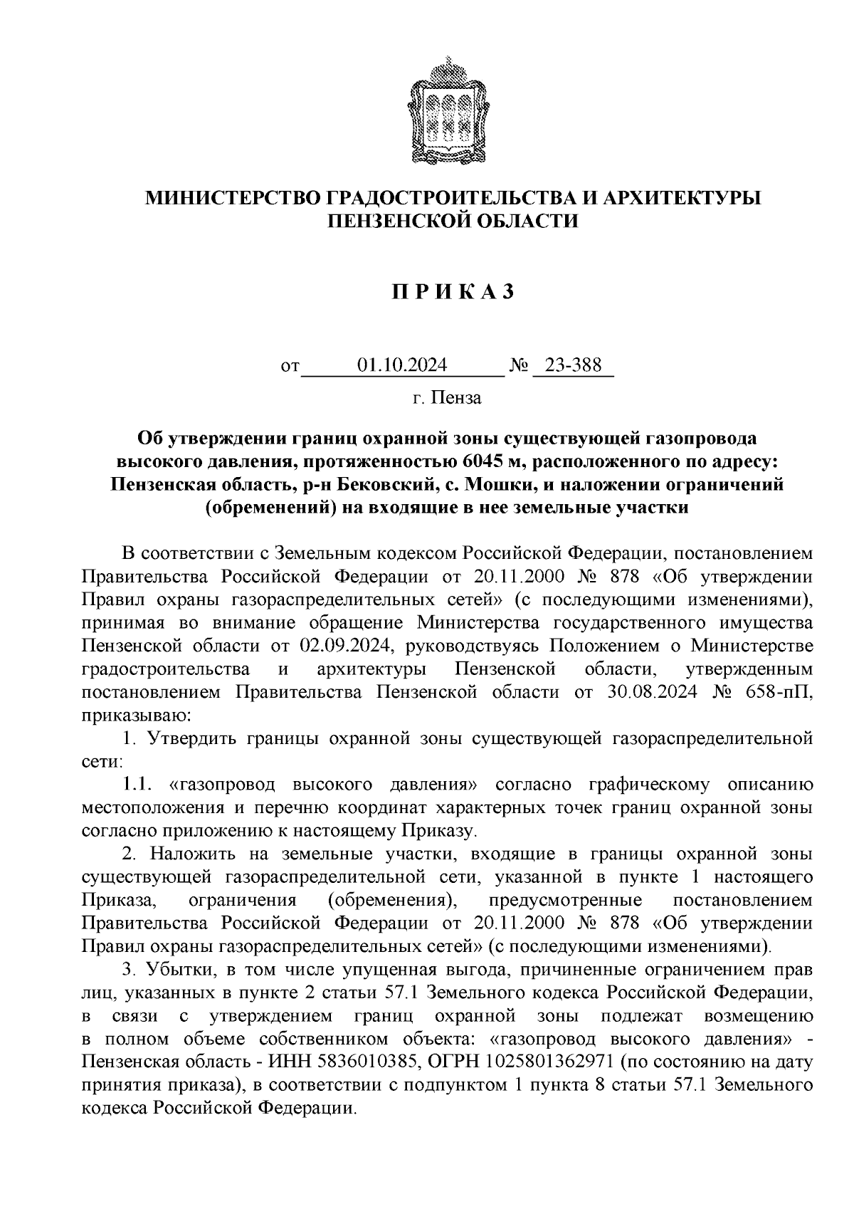 Приказ Министерства градостроительства и архитектуры Пензенской области от 01.10.2024 № 23-388