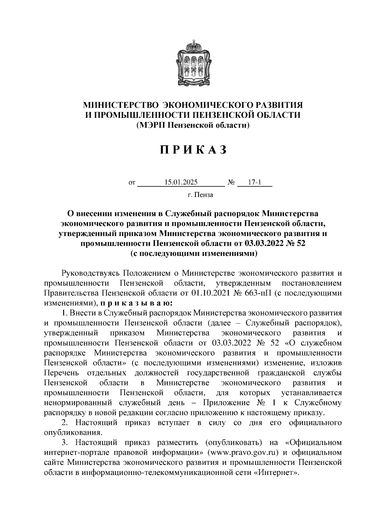 Приказ Министерства экономического развития и промышленности Пензенской области от 15.01.2025 № 17-1