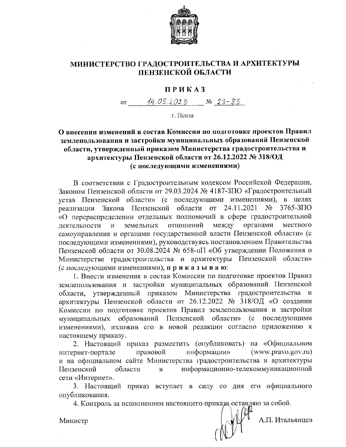 Приказ Министерства градостроительства и архитектуры Пензенской области от 14.03.2025 № 23-85