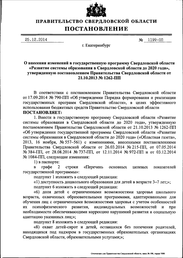Постановление Правительства Свердловской области от 25.12.2014 № 1199-ПП
