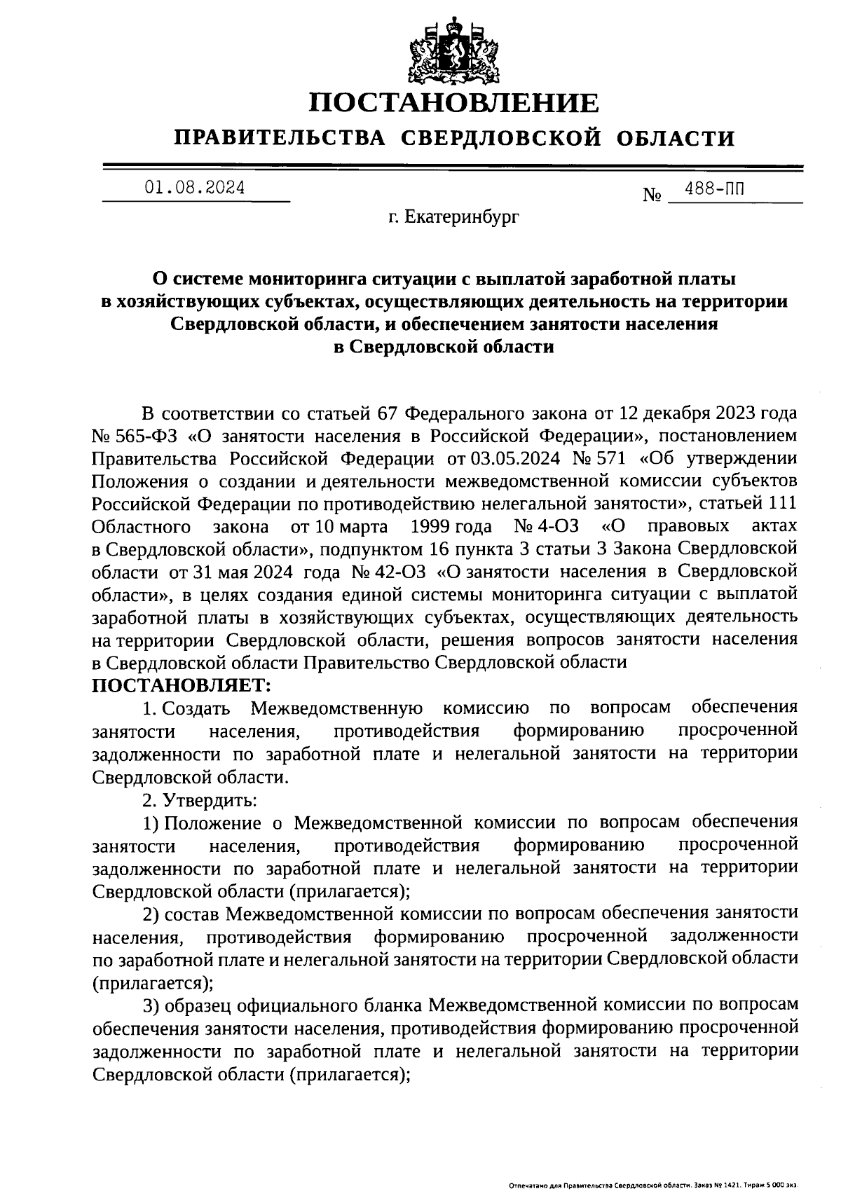 Постановление Правительства Свердловской области от 01.08.2024 № 488-ПП