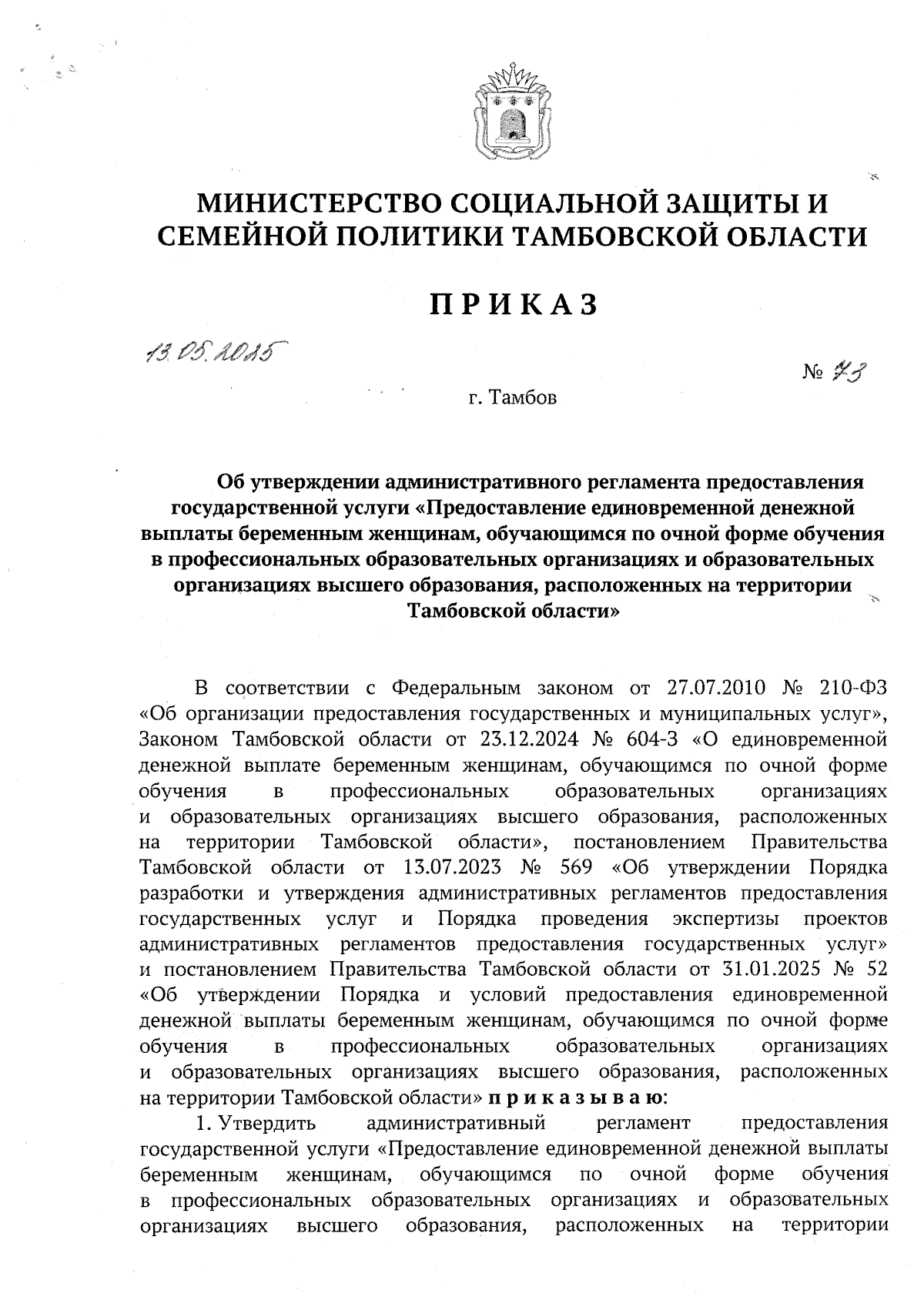 Приказ Министерства социальной защиты и семейной политики Тамбовской области от 13.05.2025 № 73