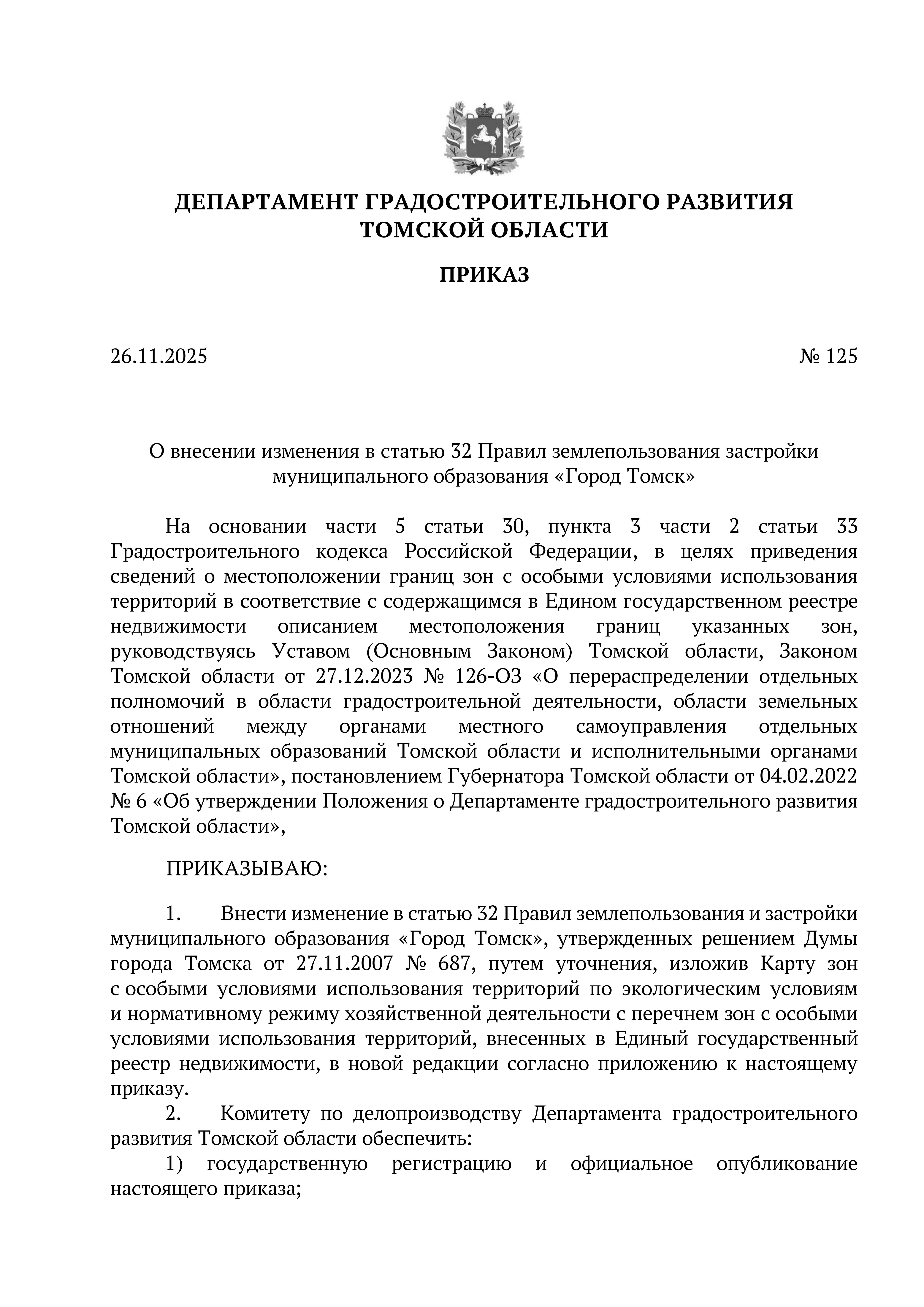Приказ Департамента градостроительного развития Томской области от 26.11.2025 № 125