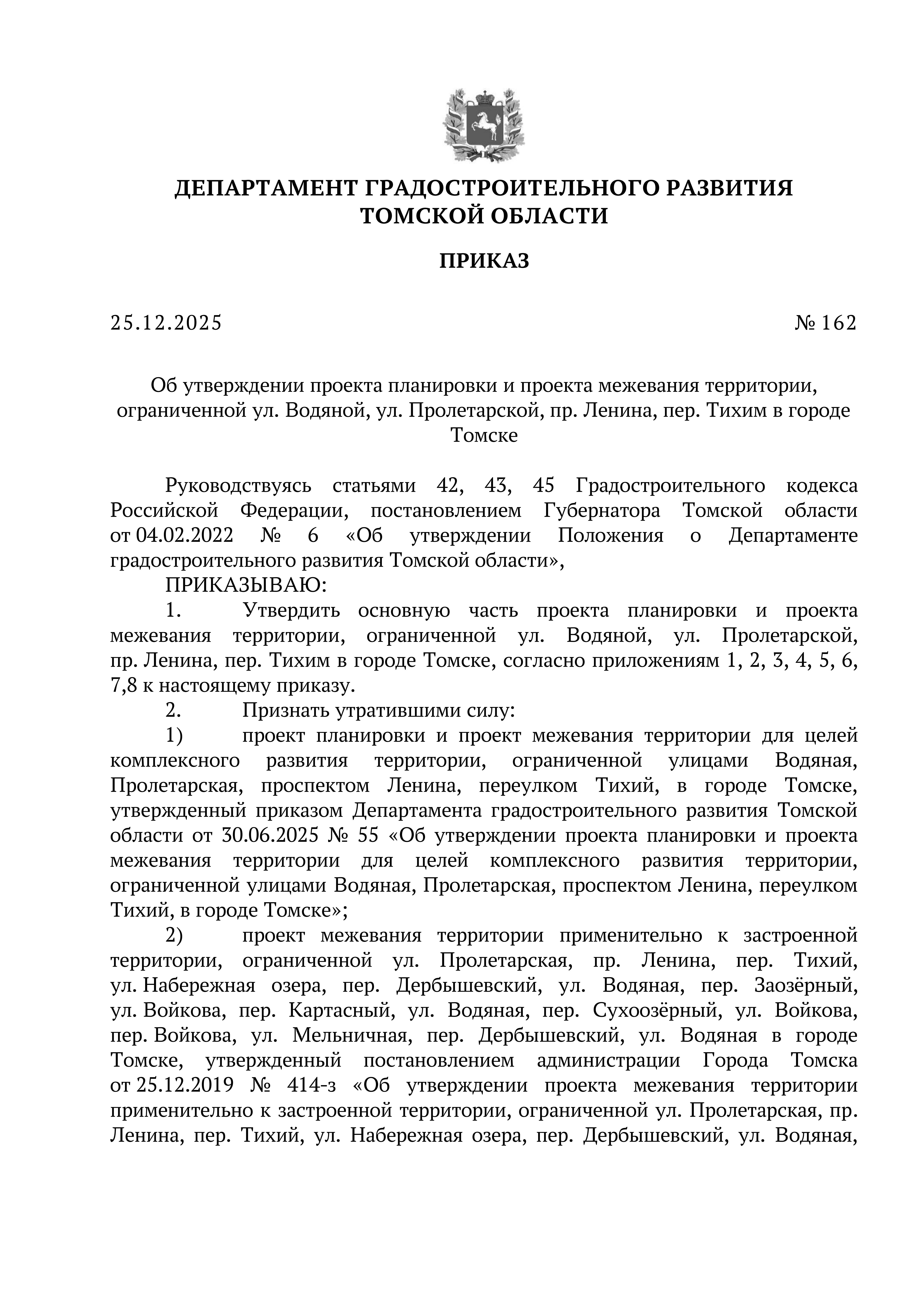 Приказ Департамента градостроительного развития Томской области от 25.12.2025 № 162