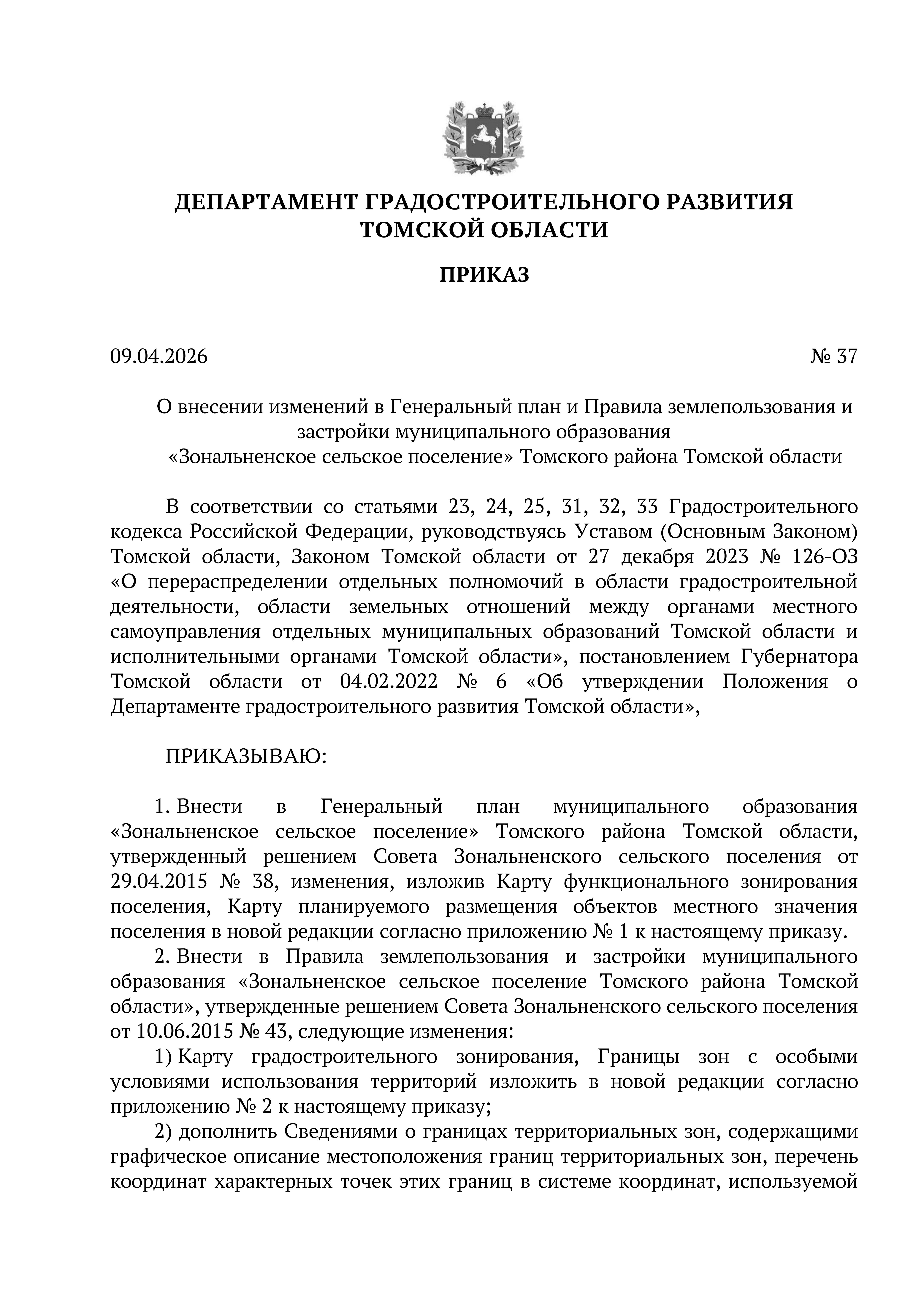 Приказ Департамента градостроительного развития Томской области от 09.04.2026 № 37