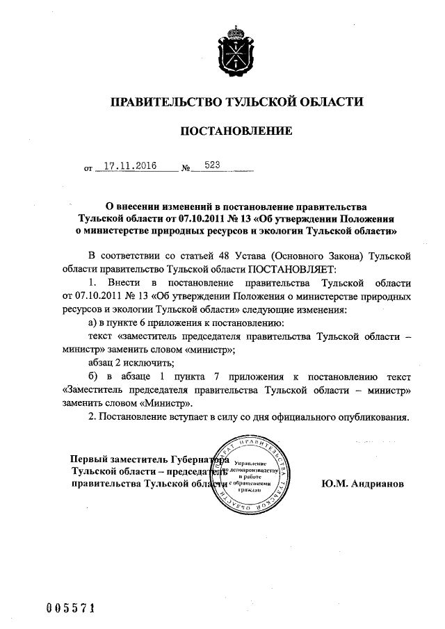 "О внесении изменений в постановление правительства Тульской области от 07.10.2011 № 13 "Об утверждении Положения о министерстве природных ресурсов и экологии Тульской области"