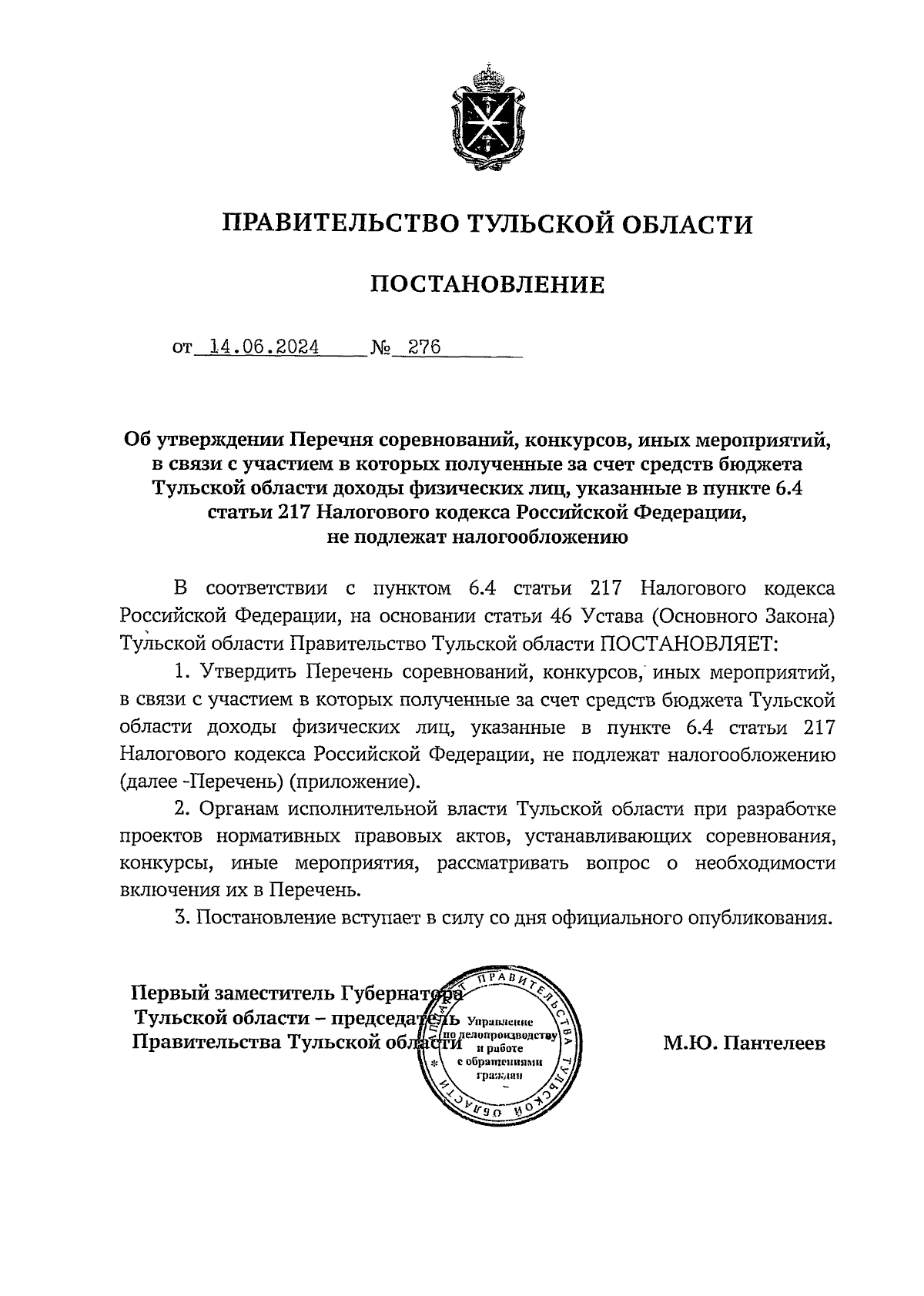 Постановление Правительства Тульской области от 14.06.2024 № 276