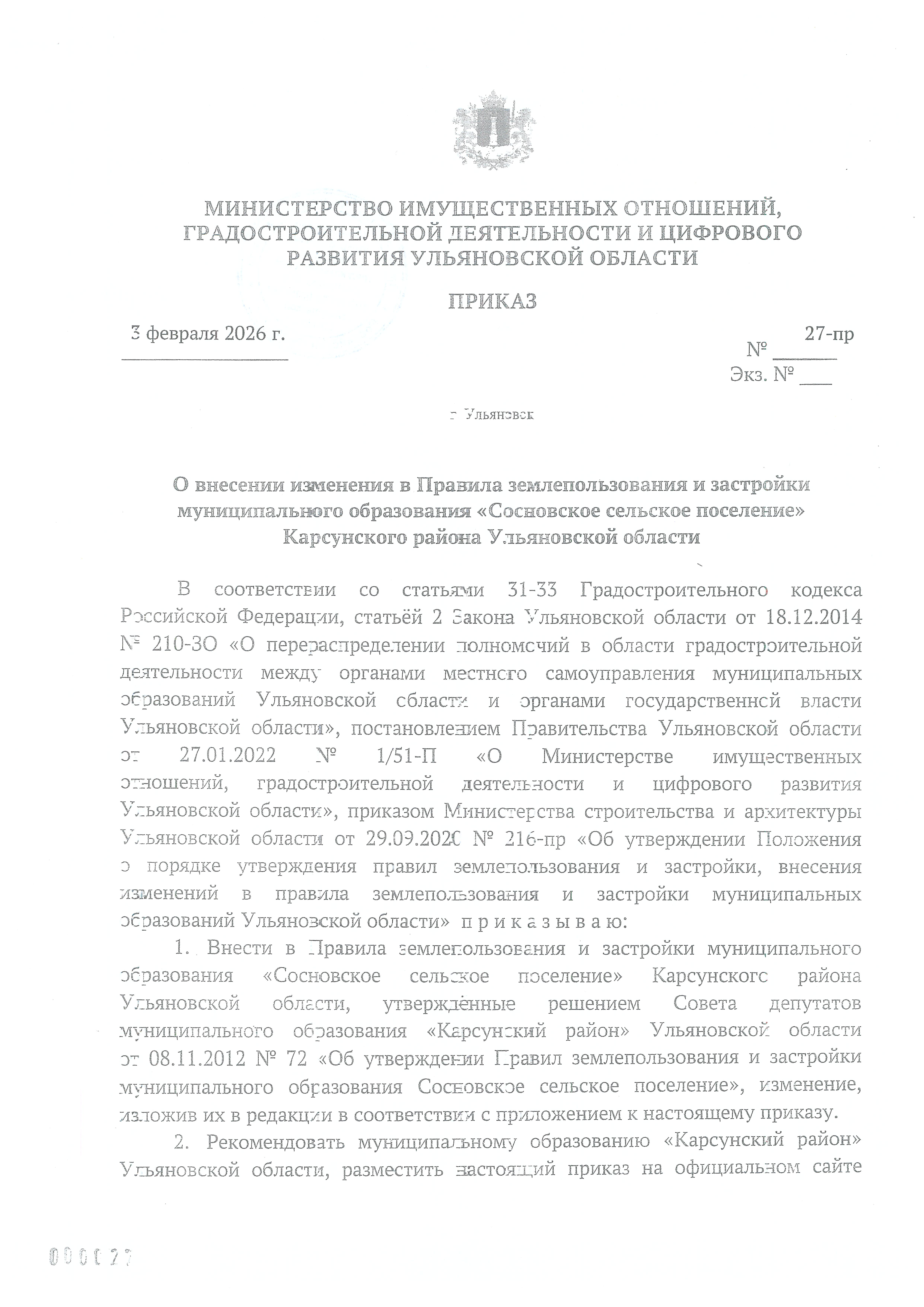 Приказ Министерства имущественных отношений, градостроительной деятельности и цифрового развития Ульяновской области от 03.02.2026 № 27-пр