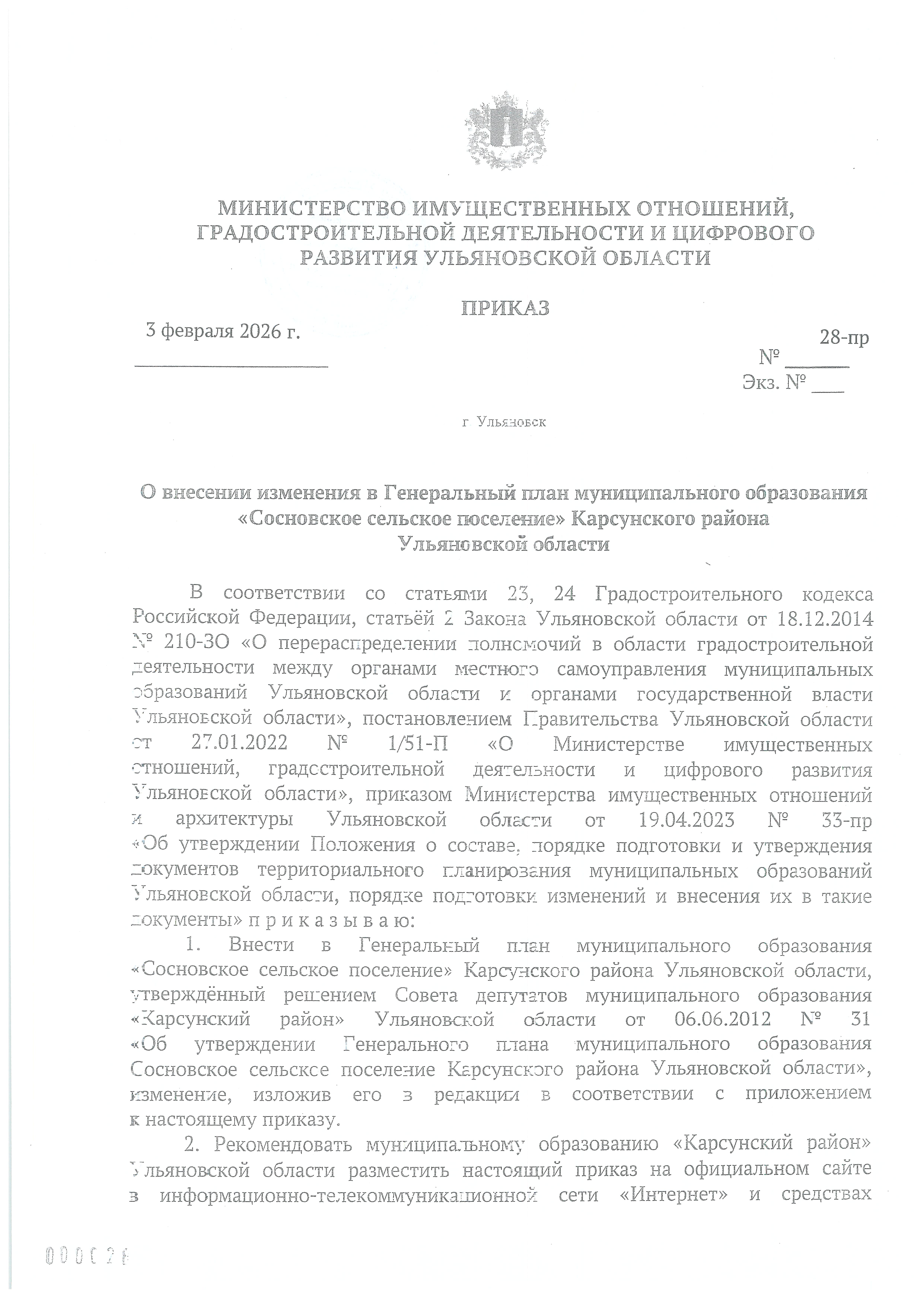 Приказ Министерства имущественных отношений, градостроительной деятельности и цифрового развития Ульяновской области от 03.02.2026 № 28-пр