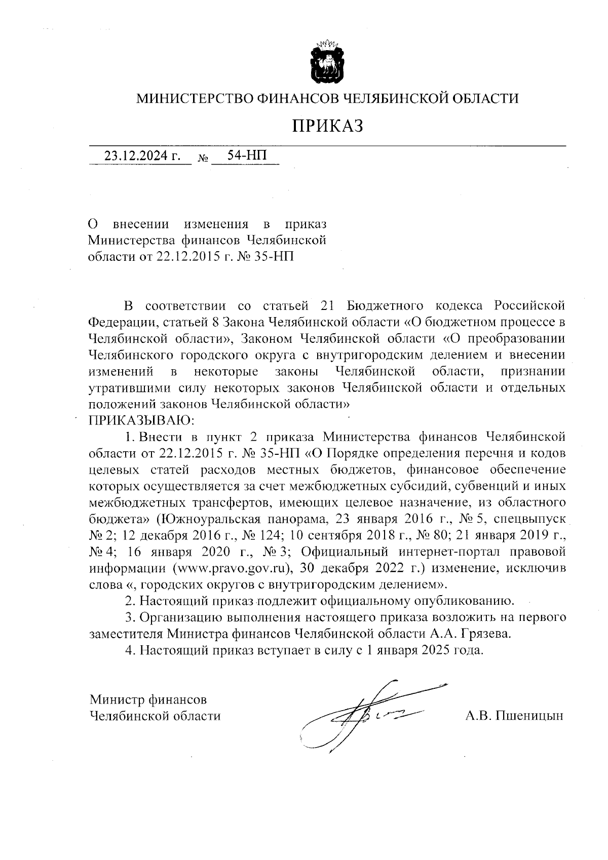 Приказ Министерства финансов Челябинской области от 23.12.2024 № 54-НП