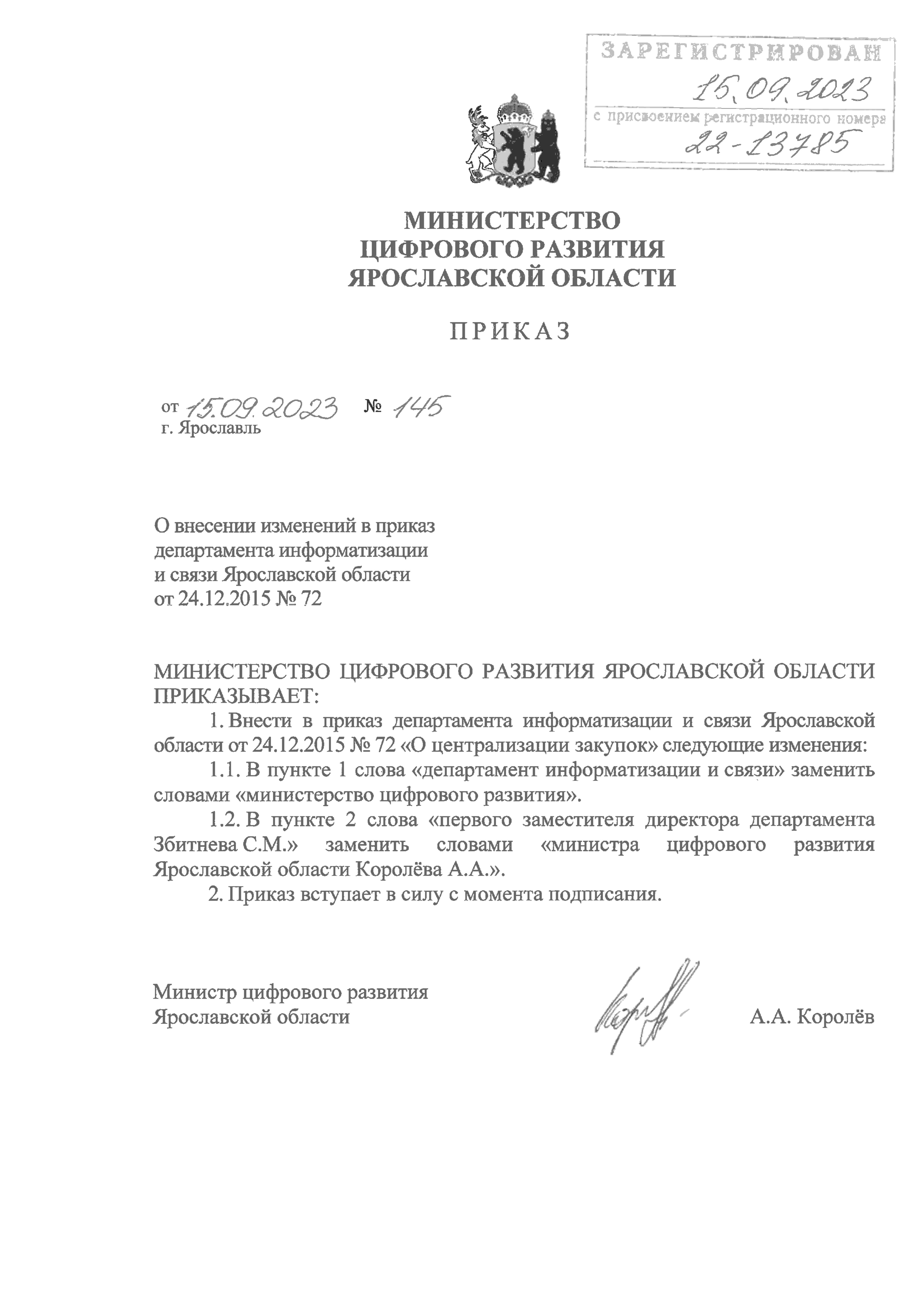Приказ министерства цифрового развития Ярославской области от 15.09.2023 № 145