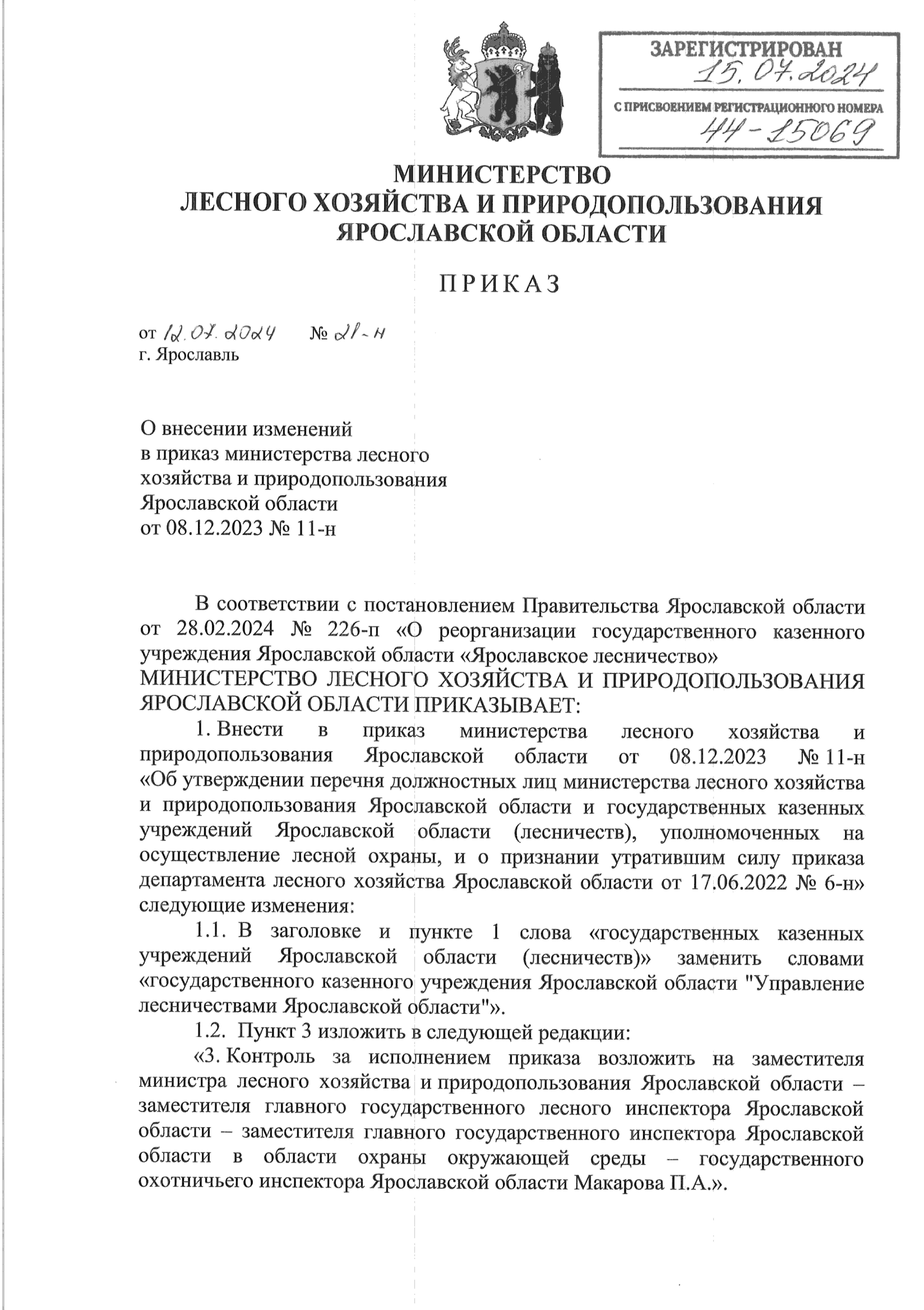 Приказ министерства лесного хозяйства и природопользования Ярославской области от 12.07.2024 № 21-н