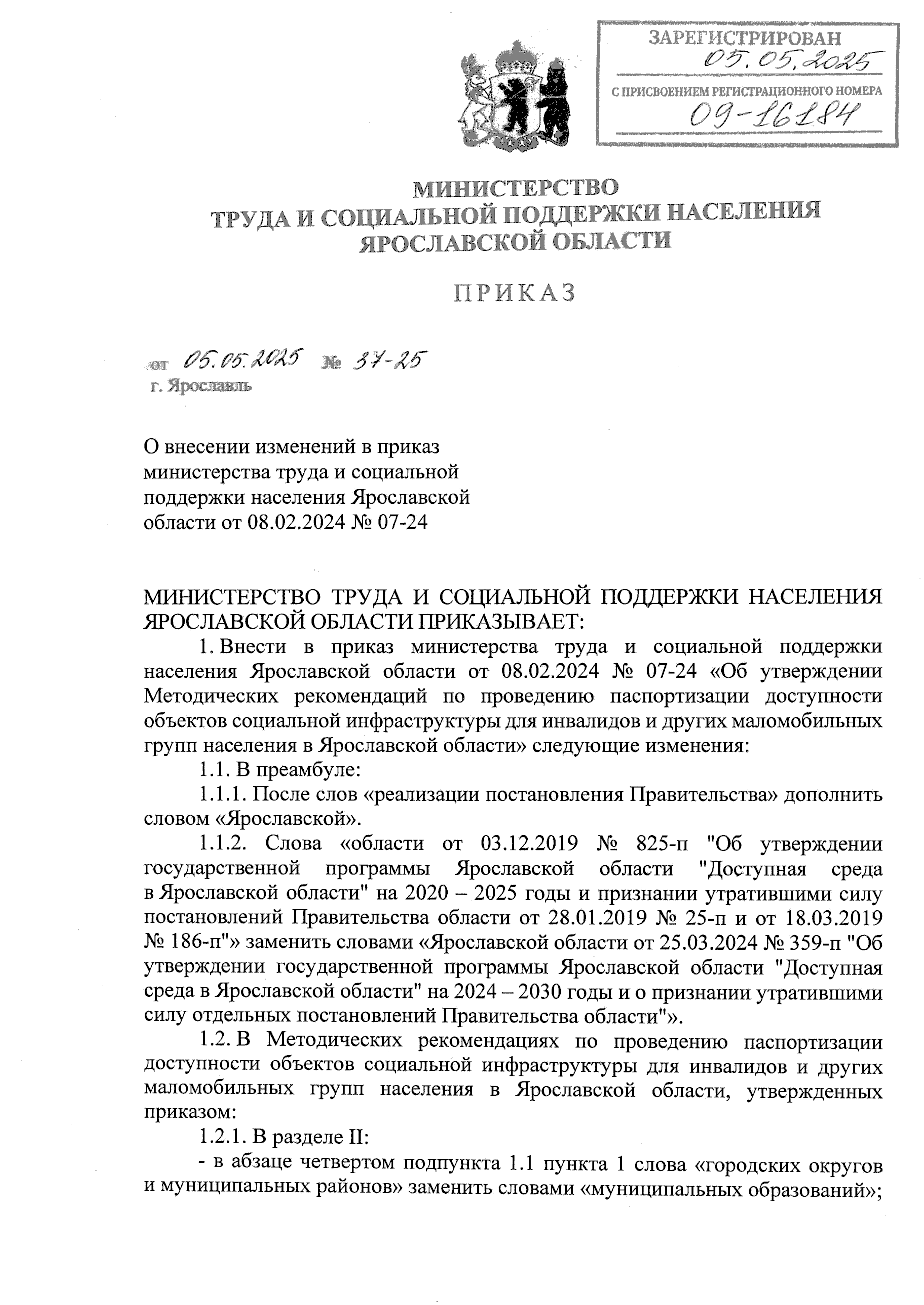 Приказ министерства труда и социальной поддержки населения Ярославской области от 05.05.2025 № 37-25