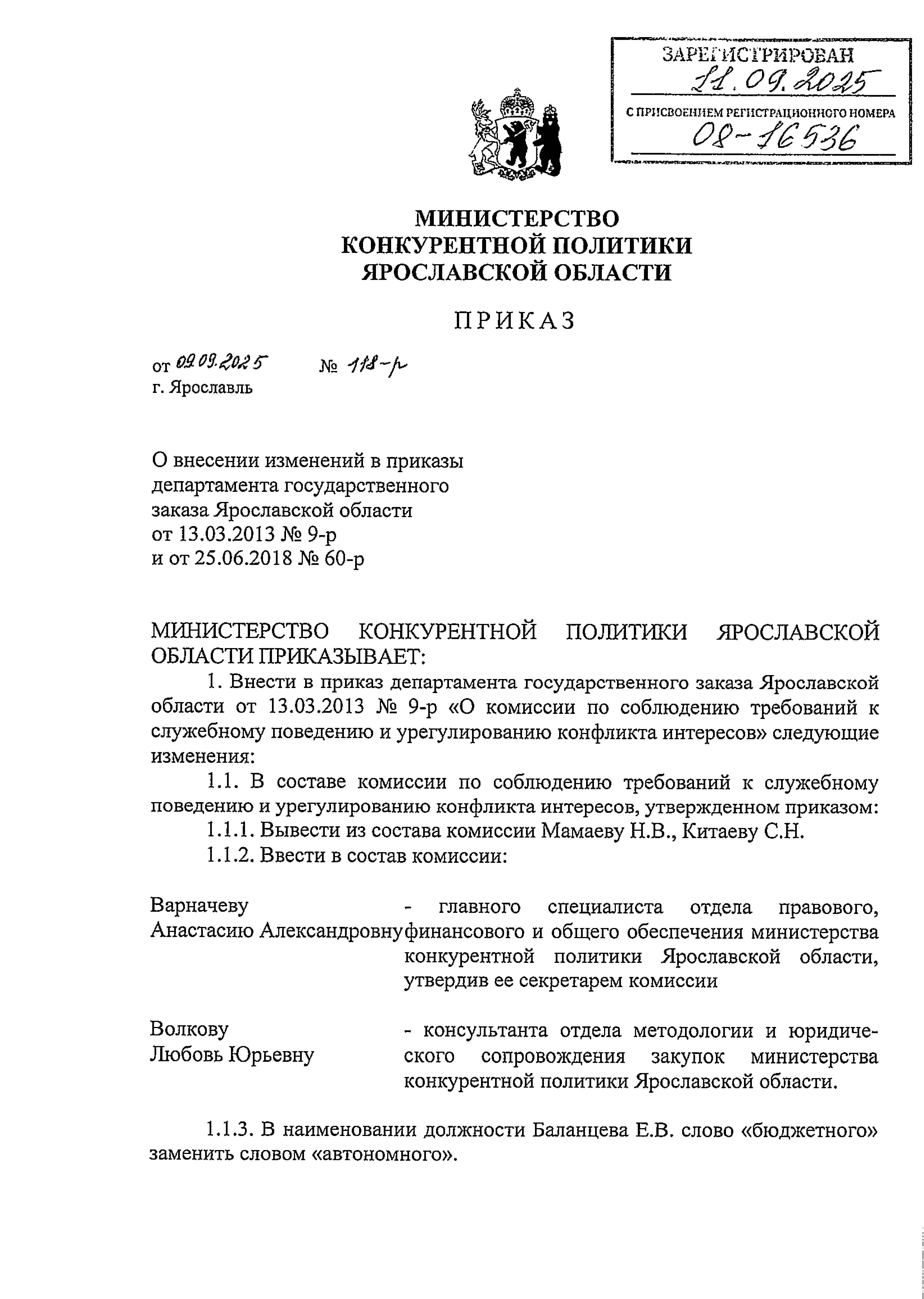 Приказ министерства конкурентной политики Ярославской области от 09.09.2025 № 118-р