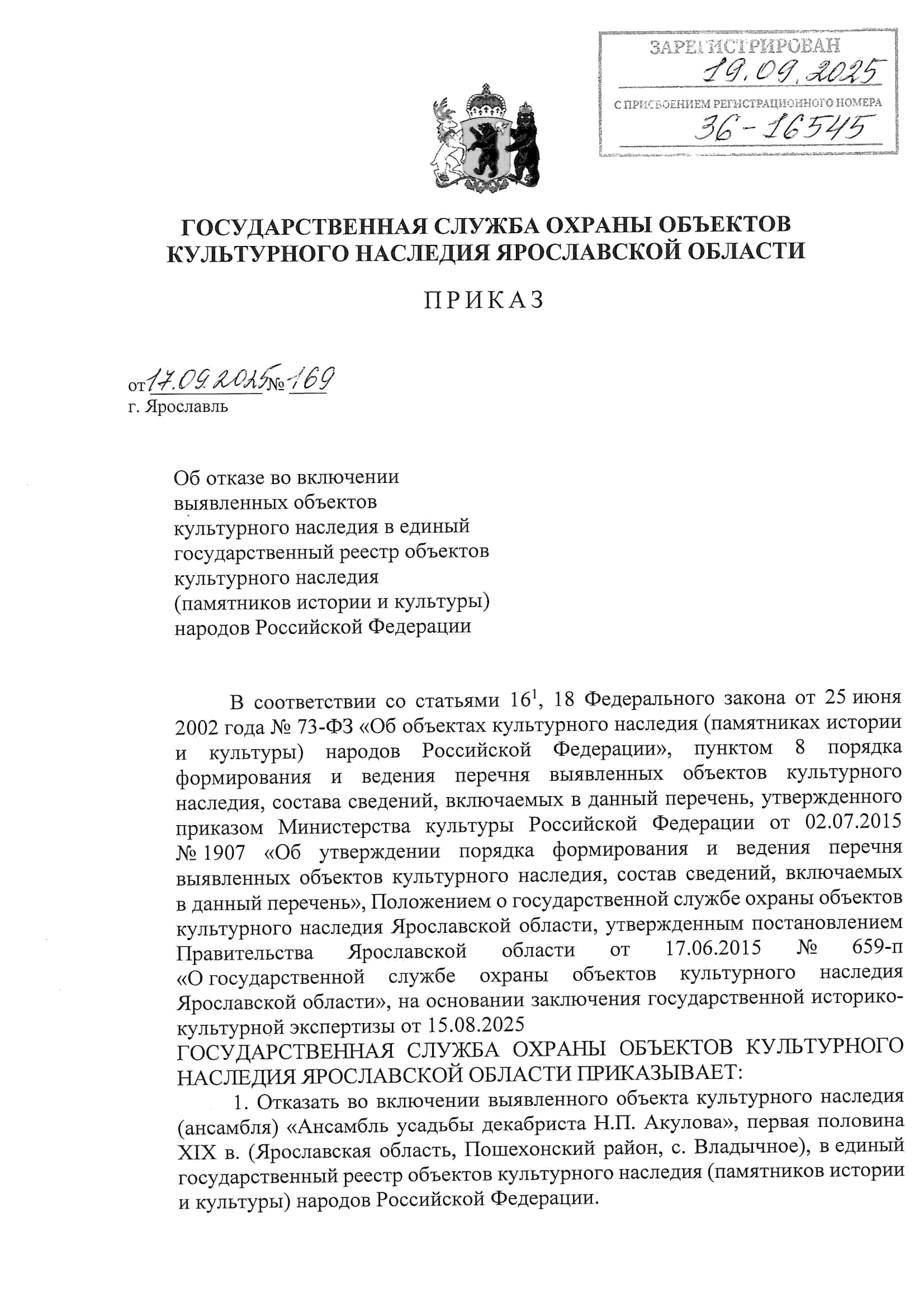 Приказ государственной службы охраны объектов культурного наследия Ярославской области от 17.09.2025 № 169