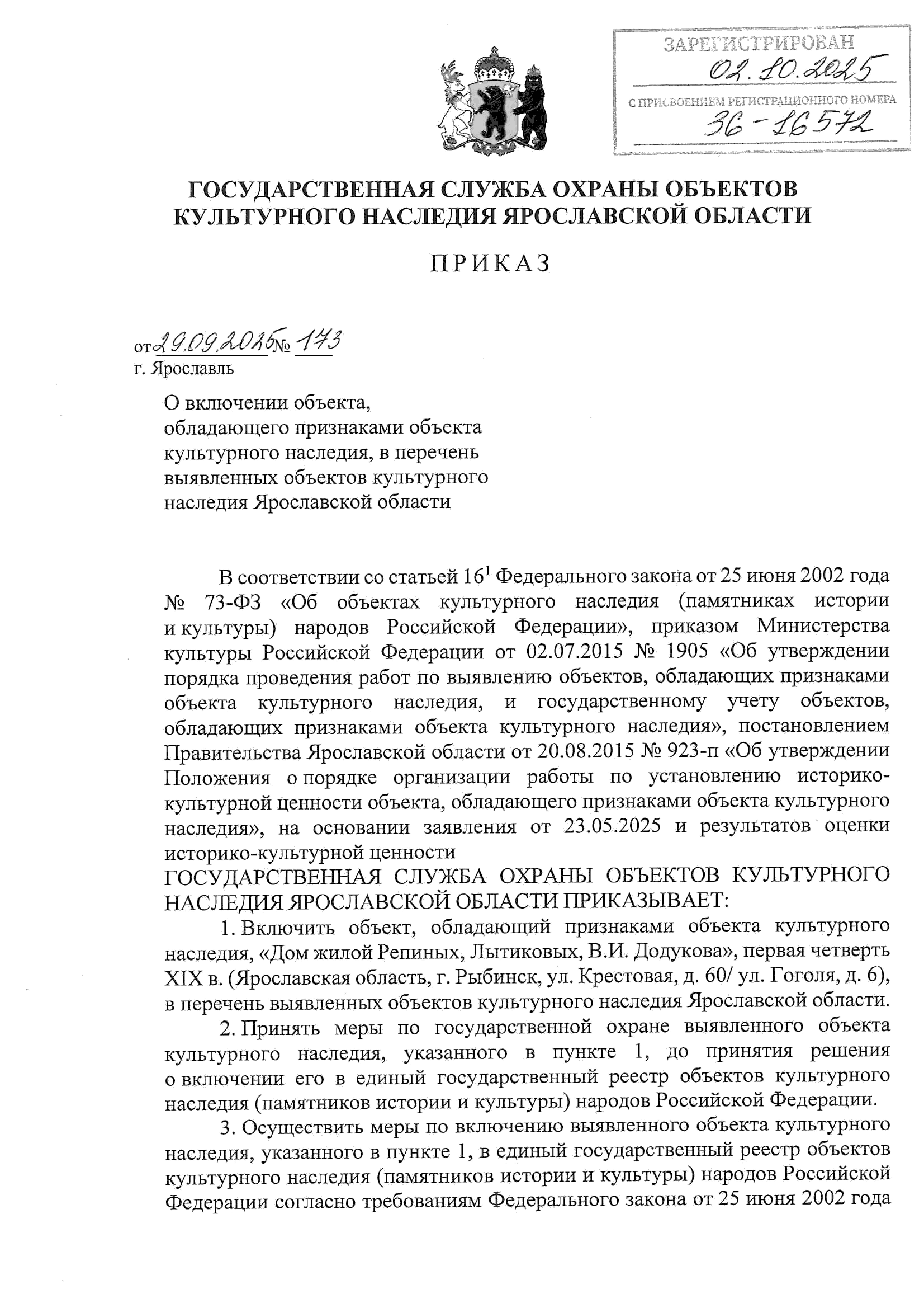 Приказ государственной службы охраны объектов культурного наследия Ярославской области от 29.09.2025 № 173
