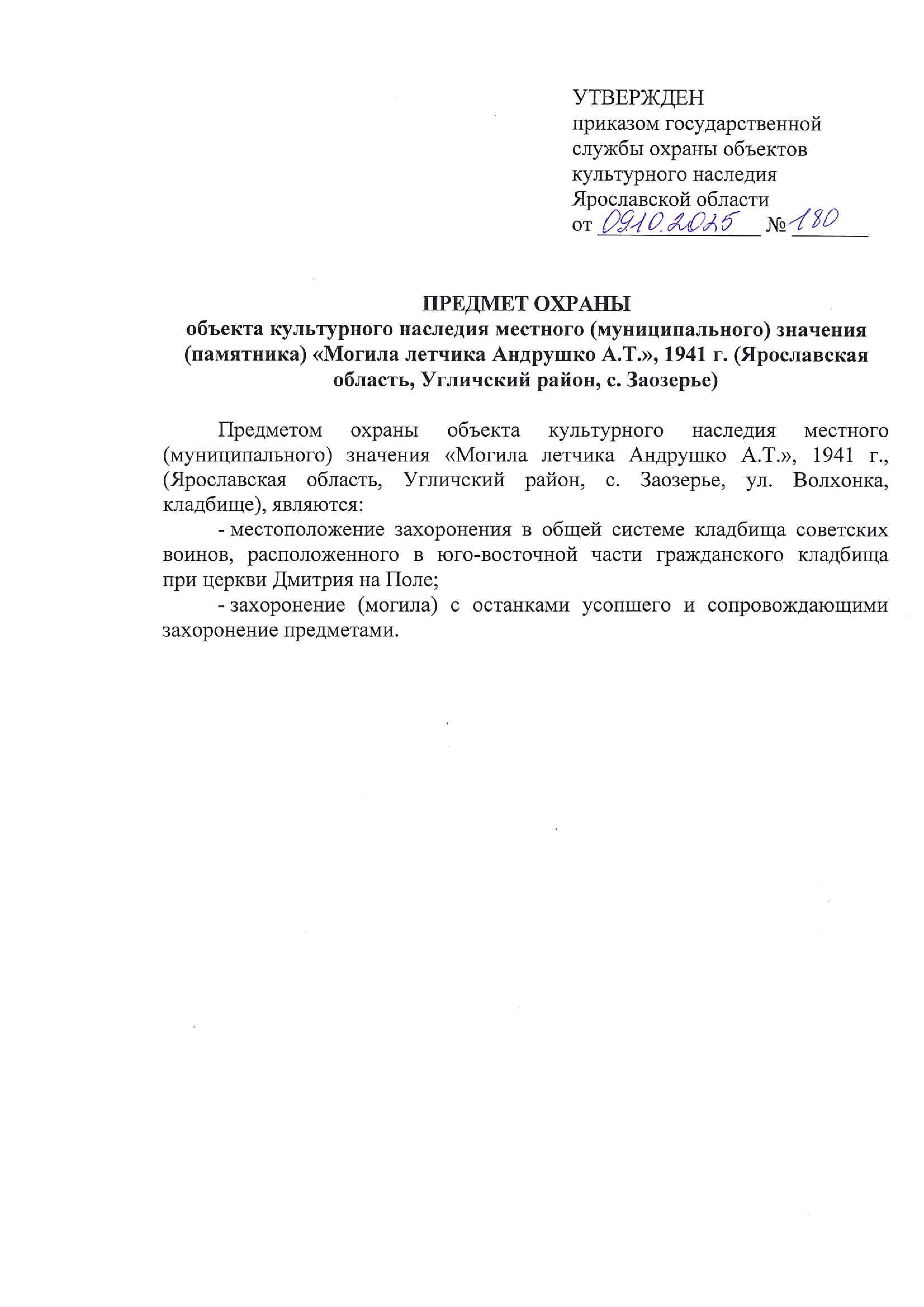 Приказ государственной службы охраны объектов культурного наследия Ярославской области от 09.10.2025 № 180