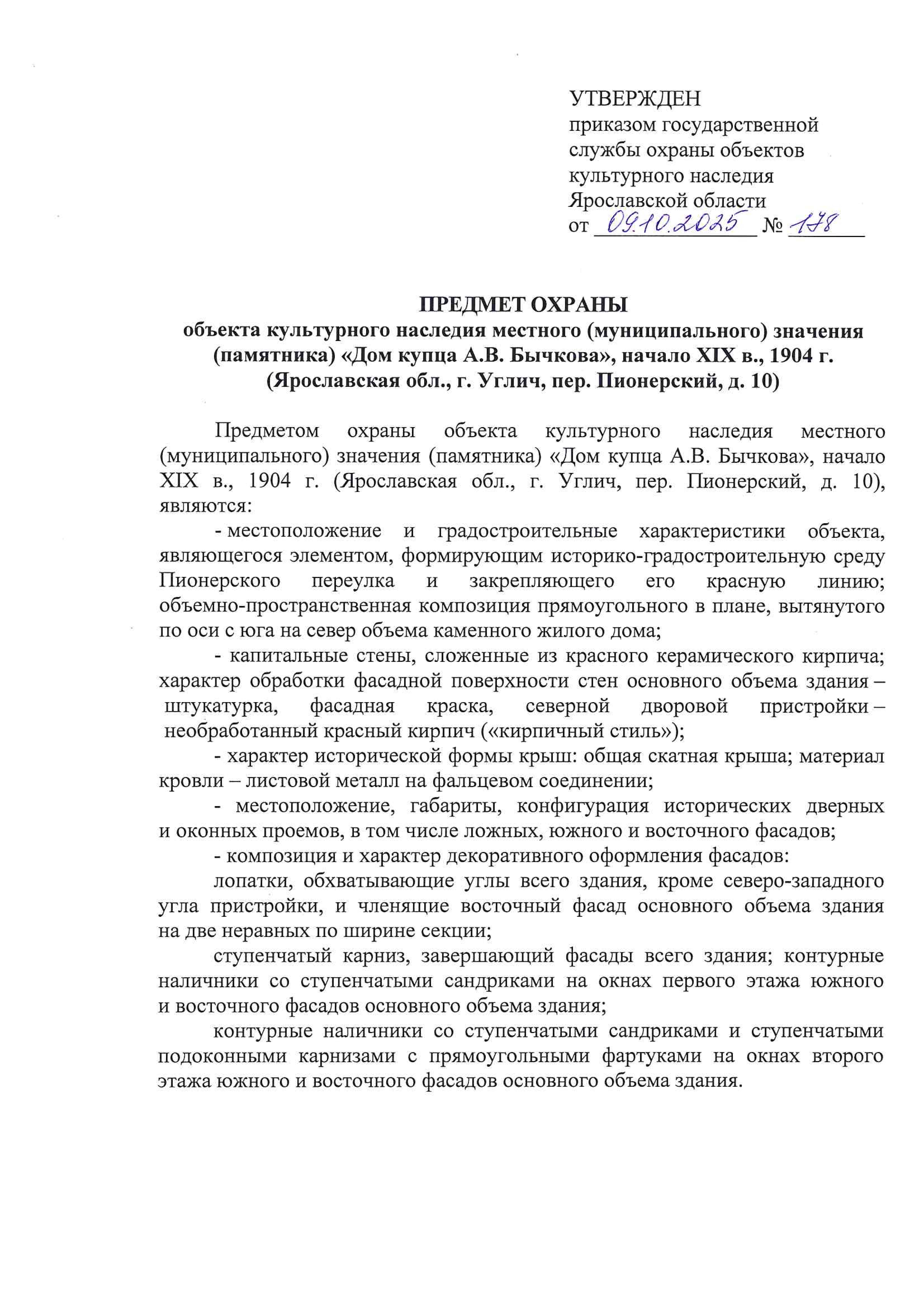 Приказ государственной службы охраны объектов культурного наследия Ярославской области от 09.10.2025 № 178