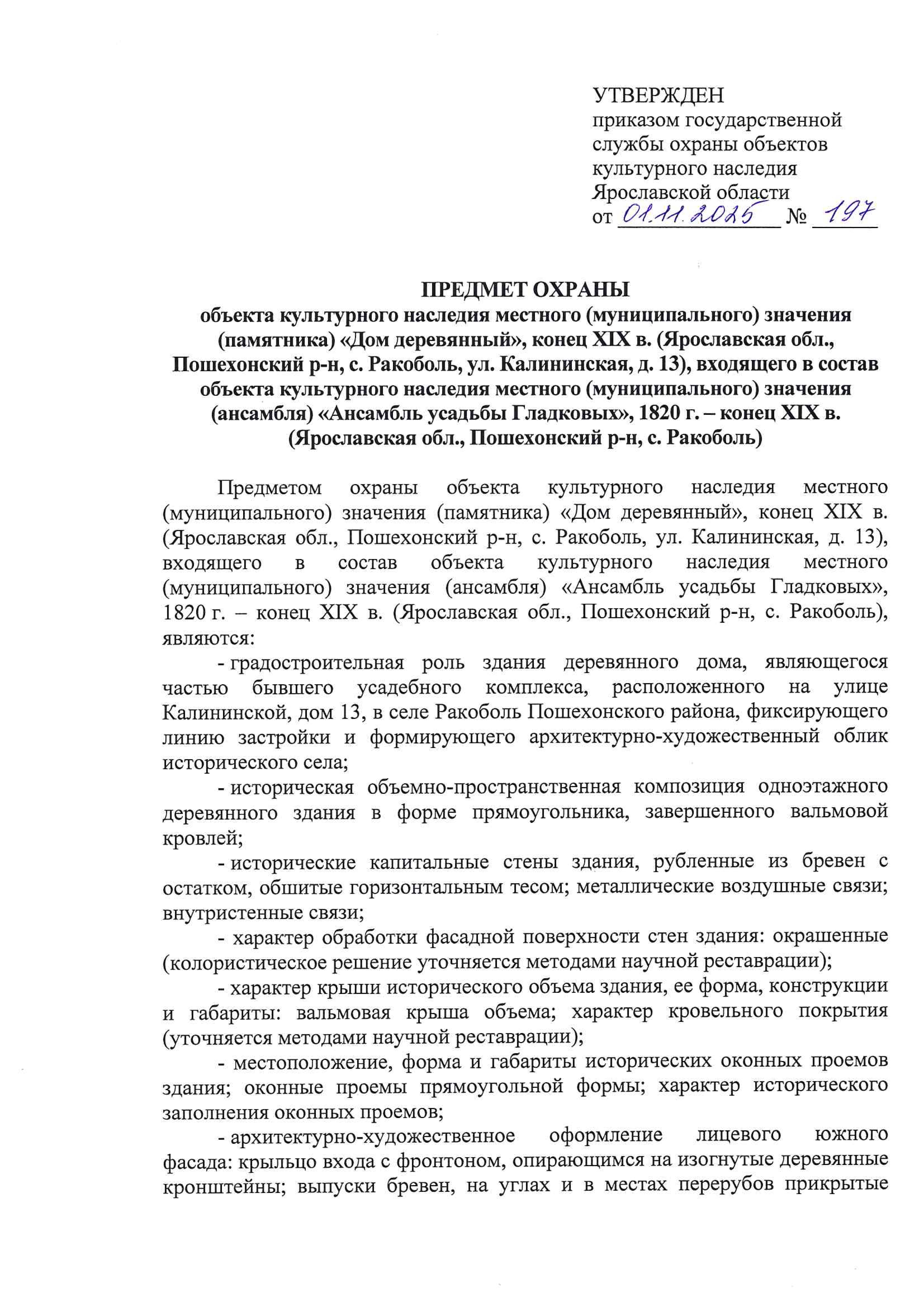 Приказ государственной службы охраны объектов культурного наследия Ярославской области от 01.11.2025 № 197