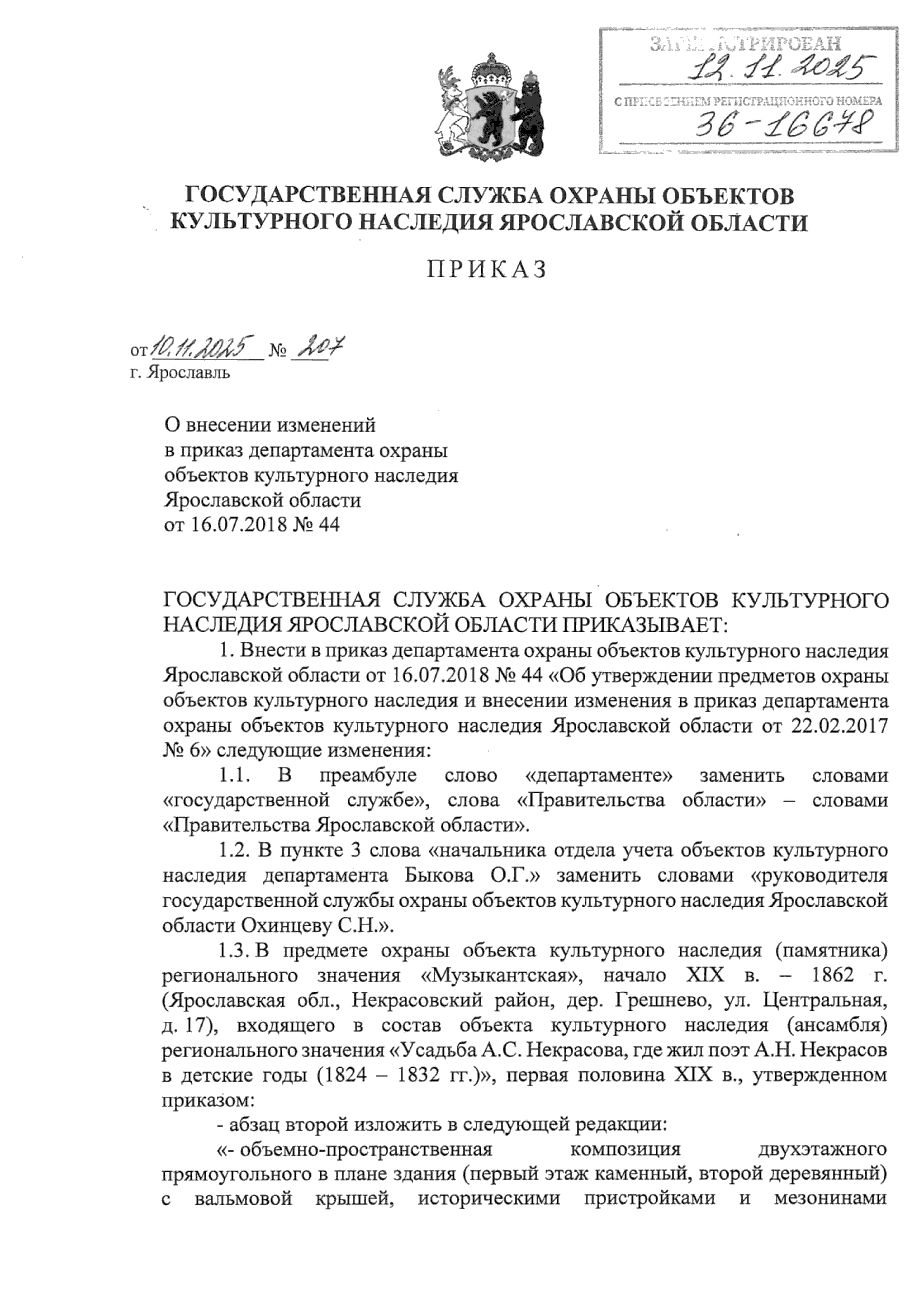 Приказ государственной службы охраны объектов культурного наследия Ярославской области от 10.11.2025 № 207