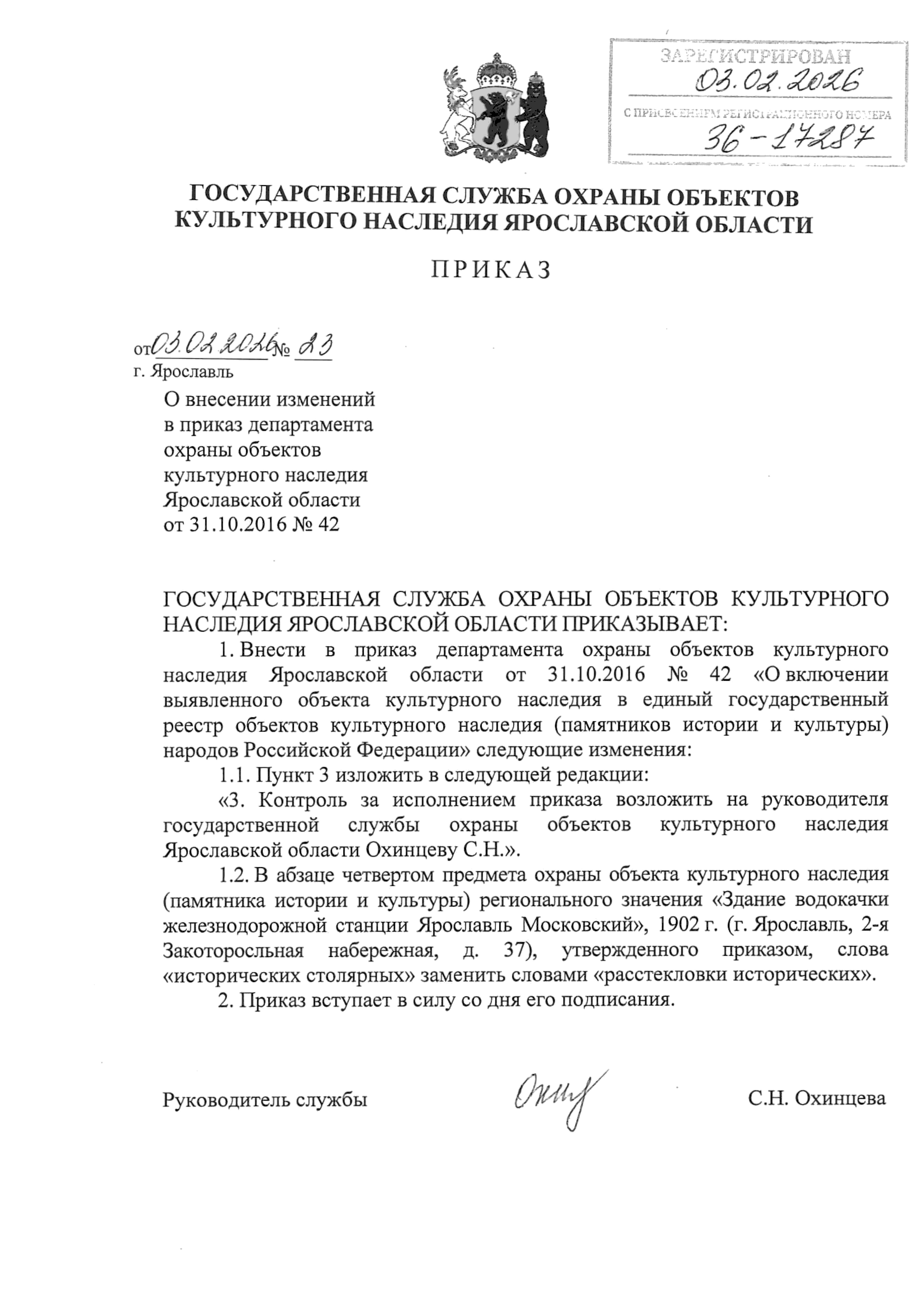 Приказ государственной службы охраны объектов культурного наследия Ярославской области от 03.02.2026 № 23