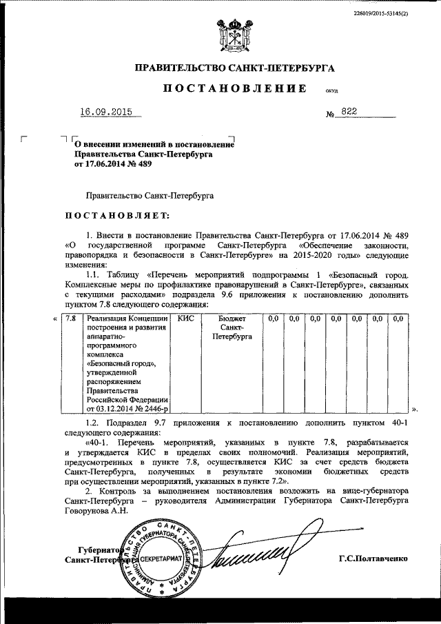 Постановление Правительства Санкт-Петербурга от 16.09.2015 № 822