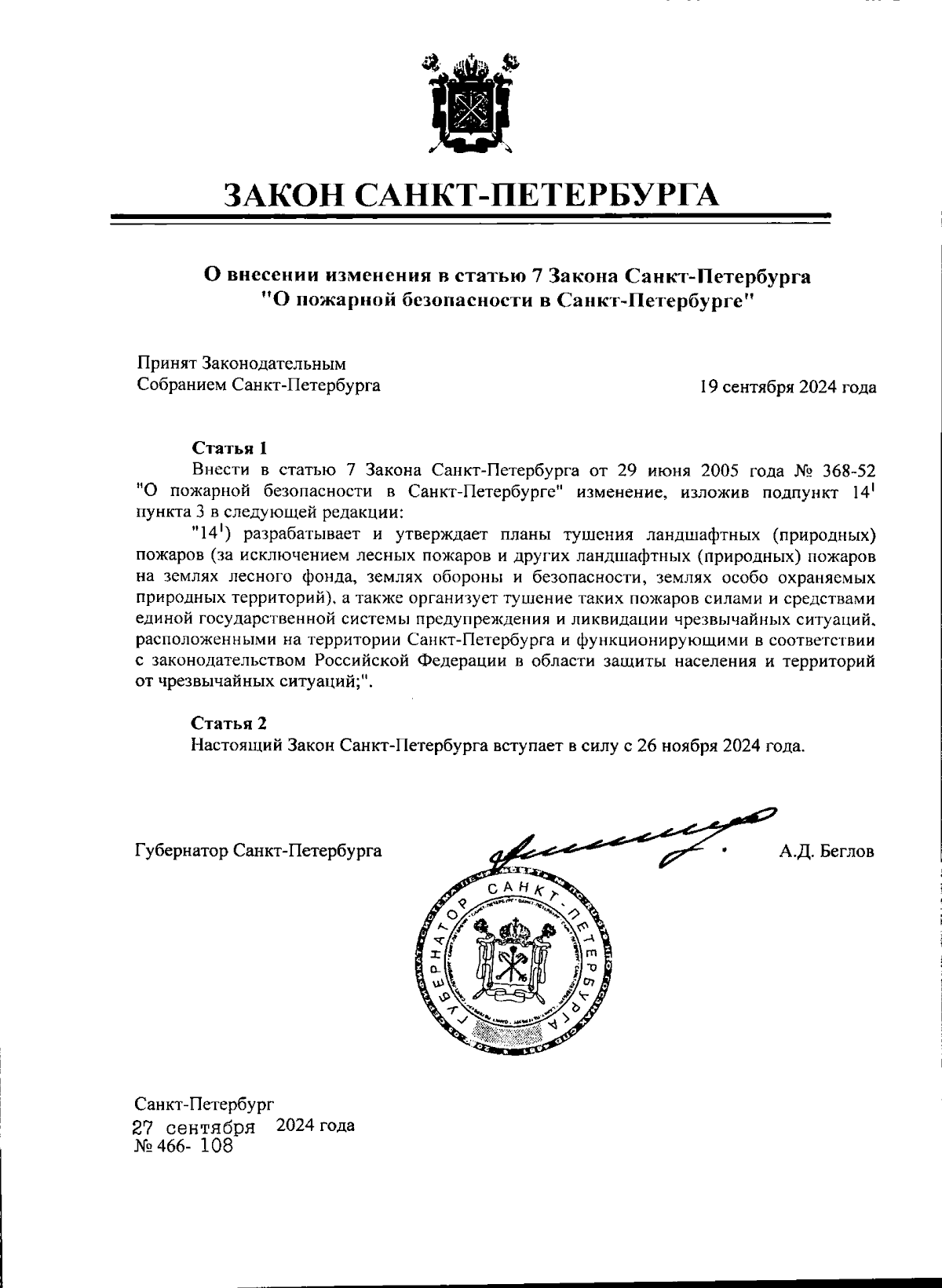 Закон Санкт-Петербурга от 19.09.2024 № 466-108
