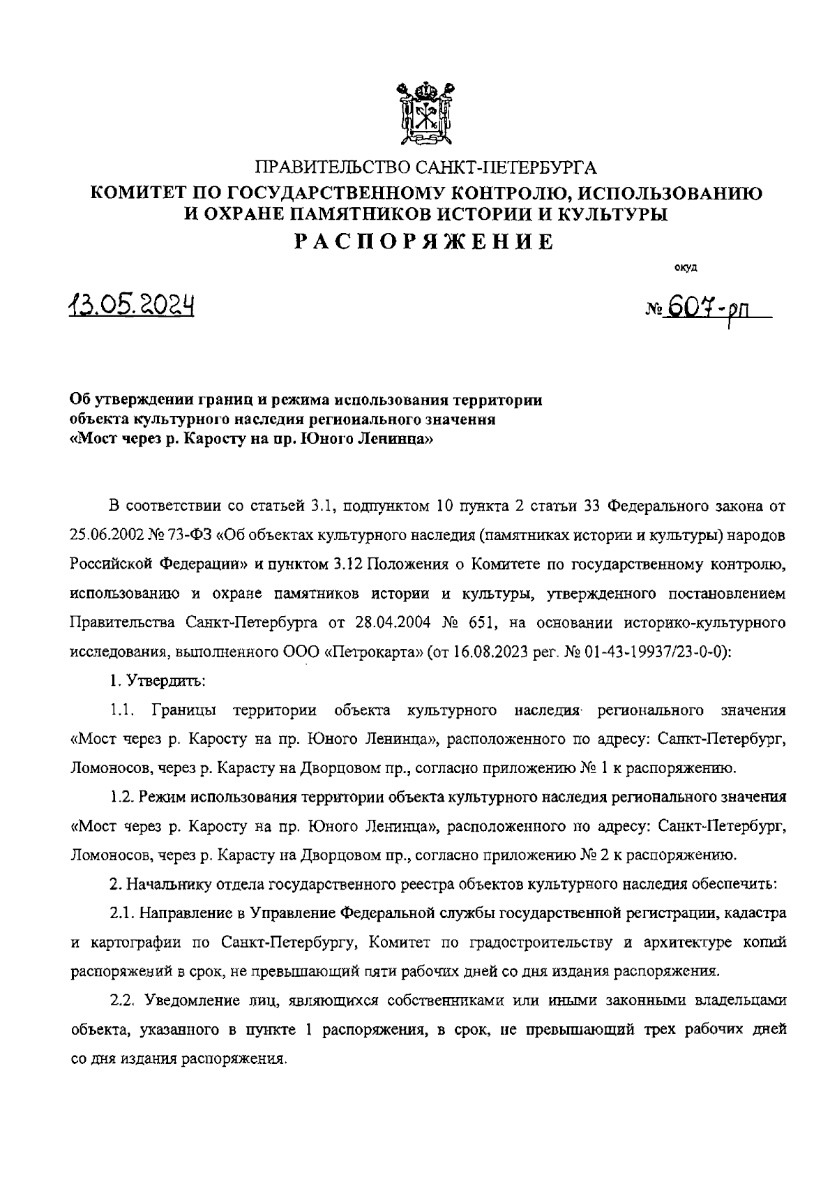 Распоряжение Комитета по государственному контролю, использованию и охране памятников истории и культуры Санкт-Петербурга от 13.05.2024 № 607-рп