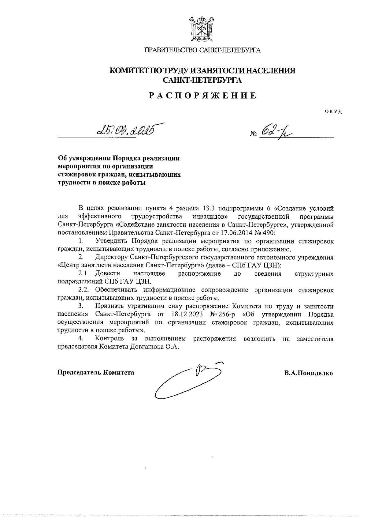 Распоряжение Комитета по труду и занятости населения Санкт-Петербурга от 25.03.2025 № 62-р