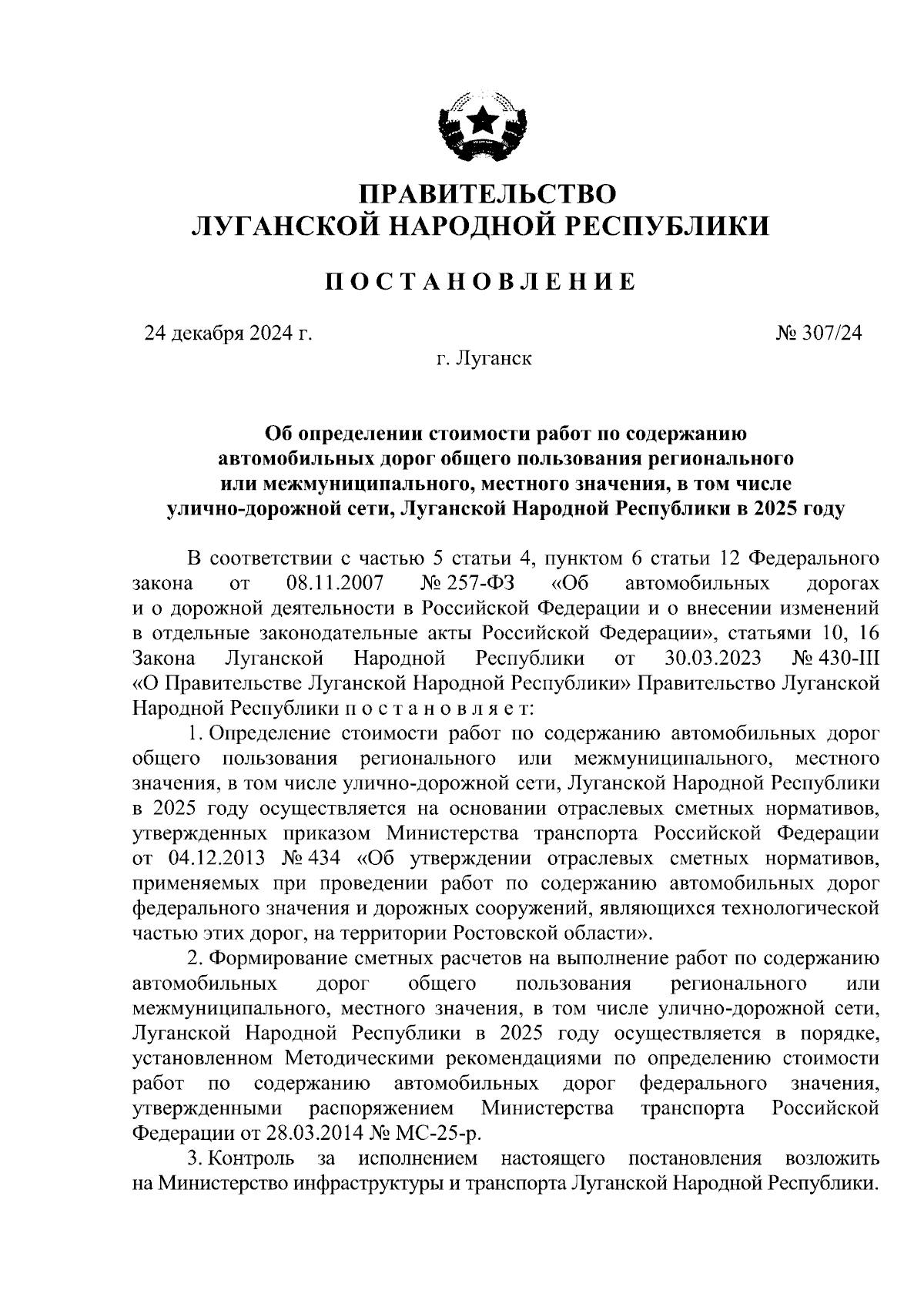 Постановление Правительства Луганской Народной Республики от 24.12.2024 № 307/24