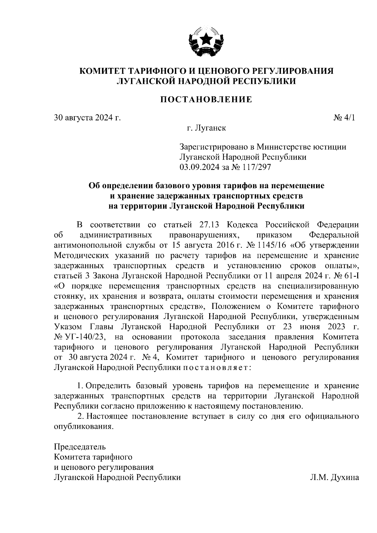 Постановление Комитета тарифного и ценового регулирования Луганской Народной Республики от 30.08.2024 № 4/1