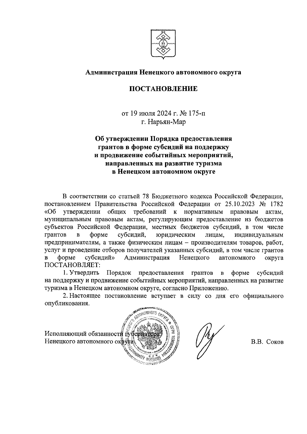 Постановление Администрации Ненецкого автономного округа от 19.07.2024 № 175-п
