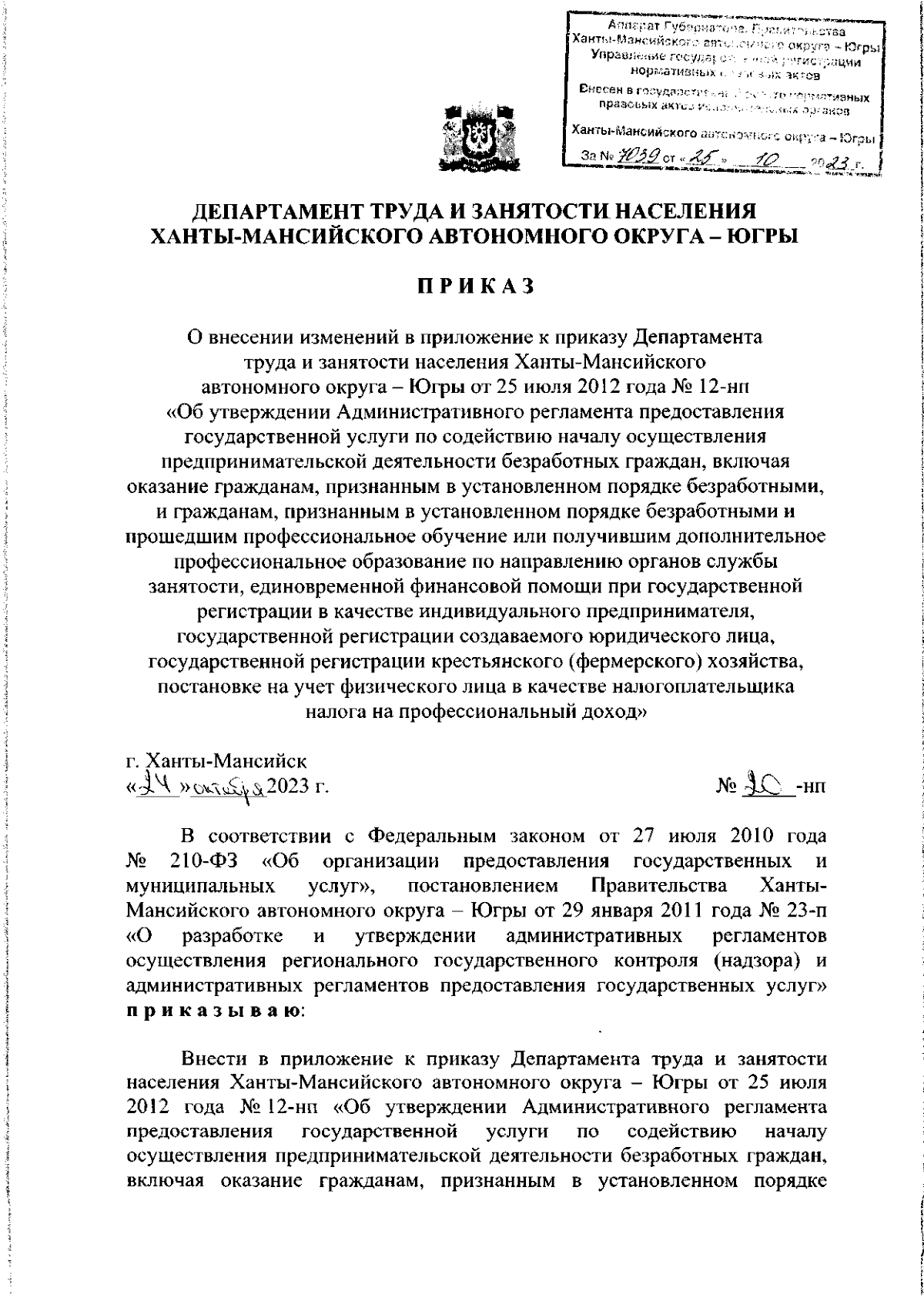"О внесении изменений в приложение к приказу Департаментатруда и занятости населения Ханты-Мансийскогоавтономного округа – Югры от 25 июля 2012 года № 12-нп"Об утверждении Административного регламента предоставления государственной услуги по содействию началу осуществления предпринимательской деятельности безработных граждан, включая оказание гражданам, признанным в установленном порядке безработными, и гражданам, признанным в установленном порядке безработными и прошедшим профессиональное обучение или получившим дополнительное профессиональное образование по направлению органов службы занятости, единовременной финансовой помощи при государственной регистрации в качестве индивидуального предпринимателя, государственной регистрации создаваемого юридического лица, государственной регистрации крестьянского (фермерского) хозяйства, постановке на учет физического лица в качестве налогоплательщика налога на профессиональный доход"