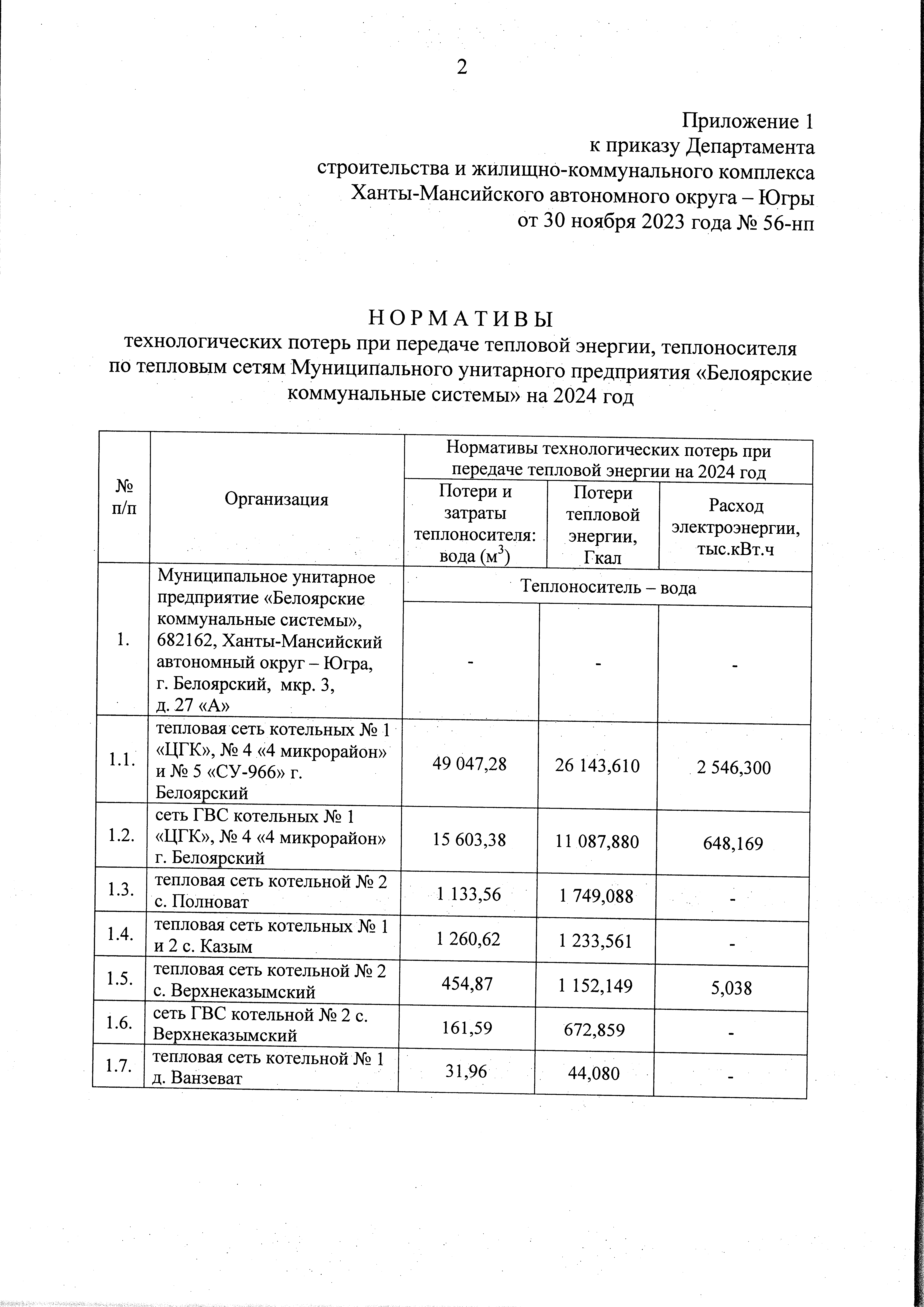 "Об утверждении нормативов технологических потерь при передаче тепловой энергии, теплоносителя по тепловым сетям, нормативов удельного расхода топлива при производстве тепловой энергии источниками тепловой энергии Муниципального унитарного предприятия "Белоярские коммунальные системы" на 2024 год"