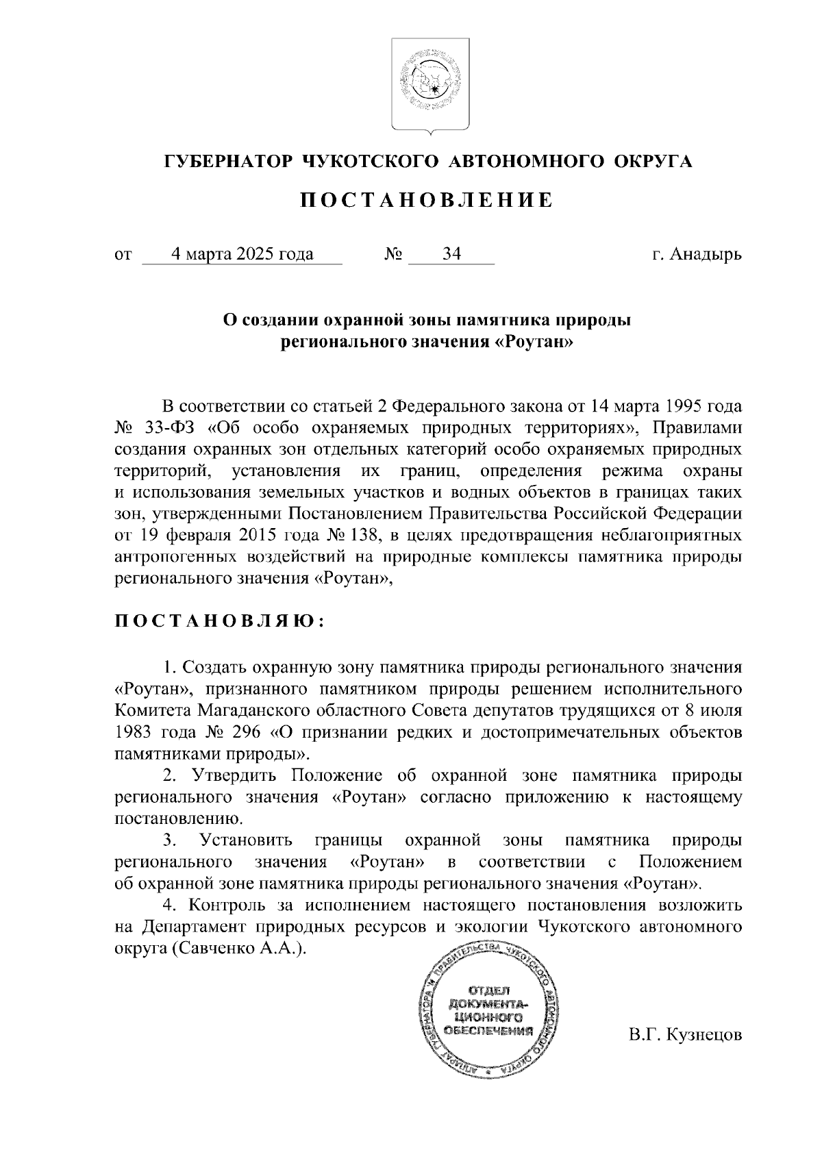 Постановление Губернатора Чукотского автономного округа от 04.03.2025 № 34
