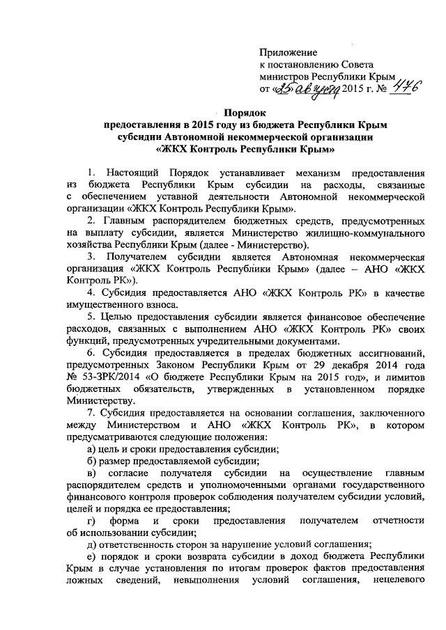 "Об утверждении Порядка предоставления в 2015 году из бюджета Республики Крым субсидии Автономной некоммерческой организации "ЖКХ Контроль Республики Крым"