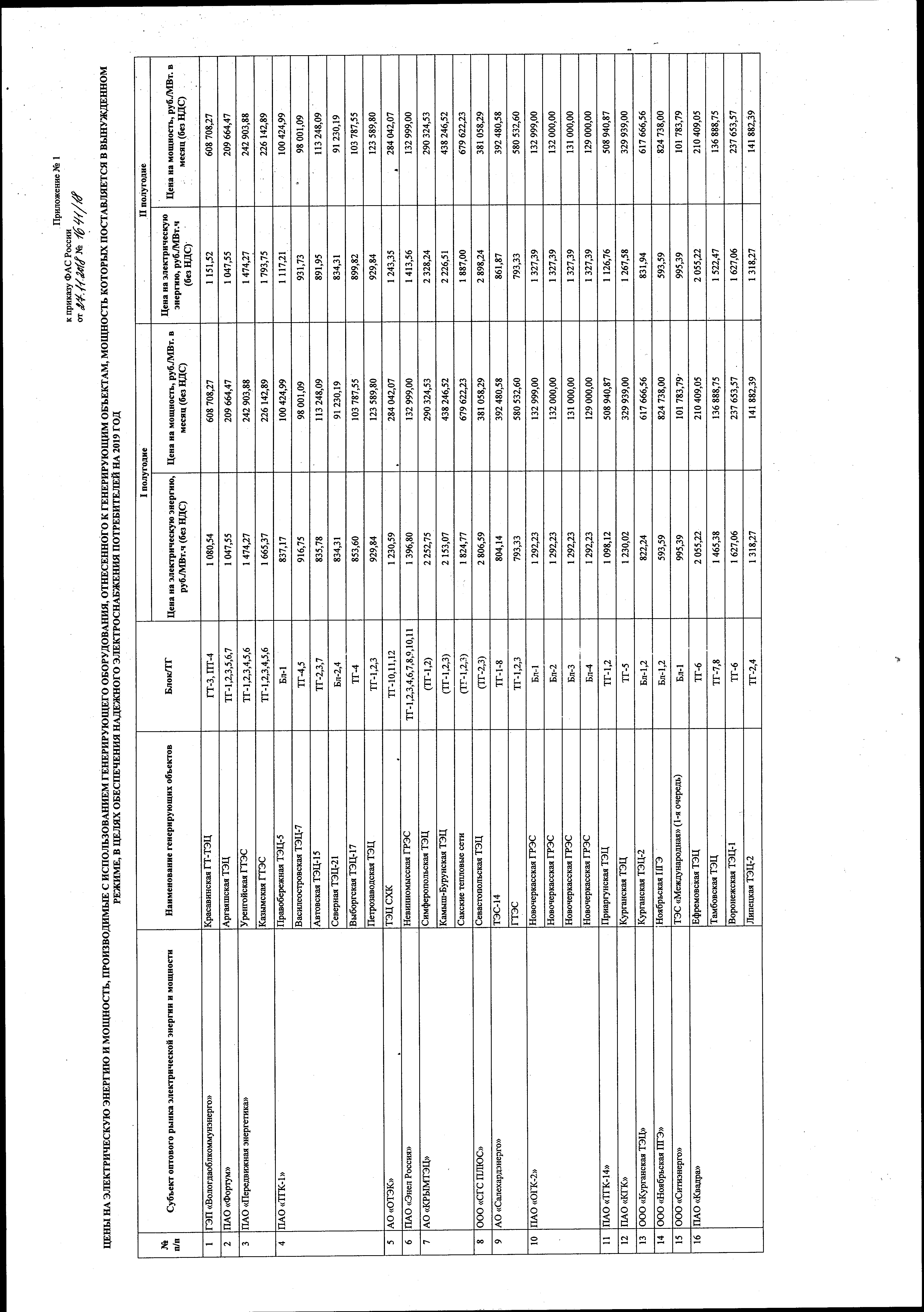 "Об утверждении цен на электрическую энергию и мощность, производимые с использованием генерирующих объектов, поставляющих мощность в вынужденном режиме, на 2019 под"