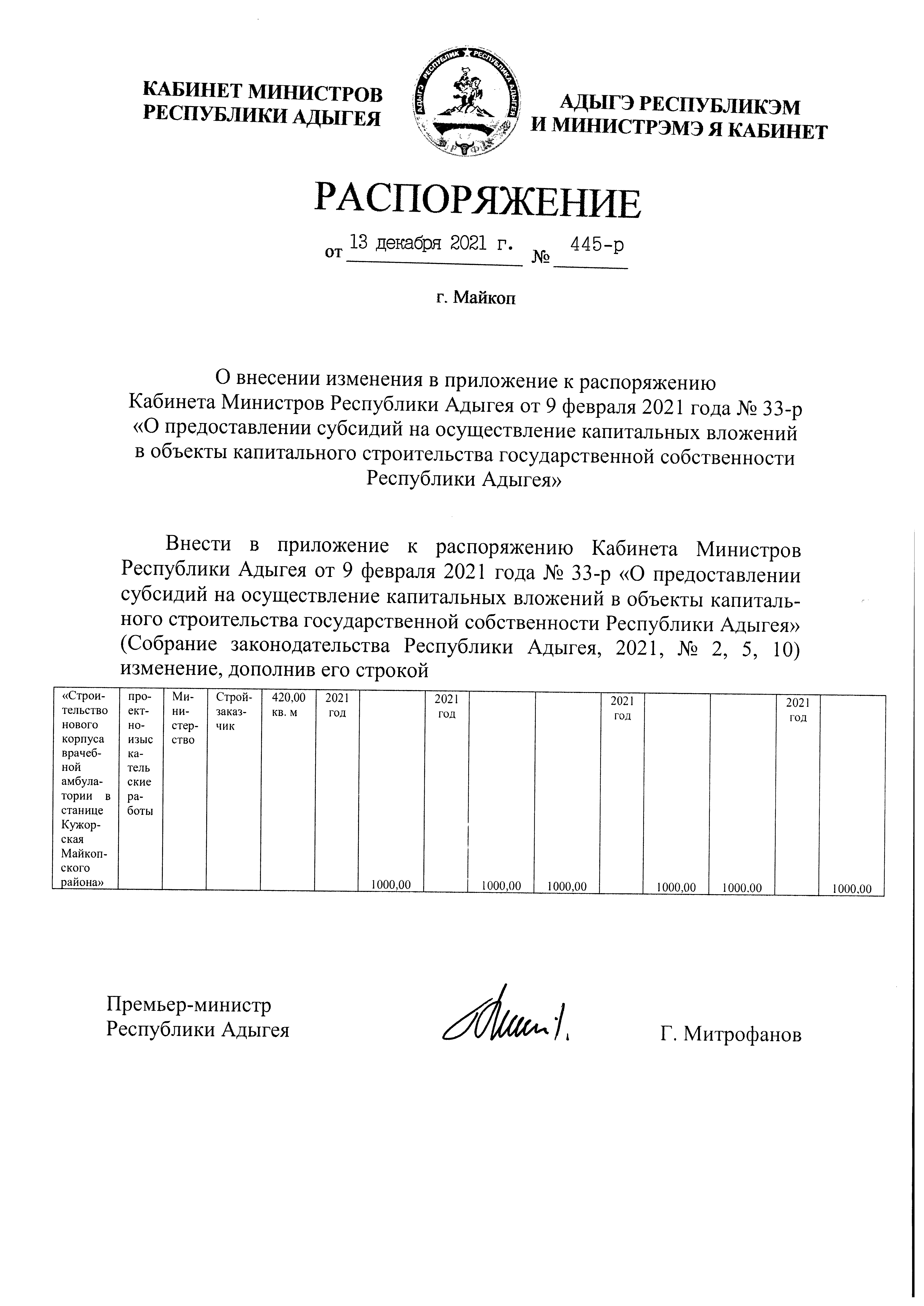 Распоряжение Кабинета Министров Республики Адыгея от 13.12.2021 № 445-р