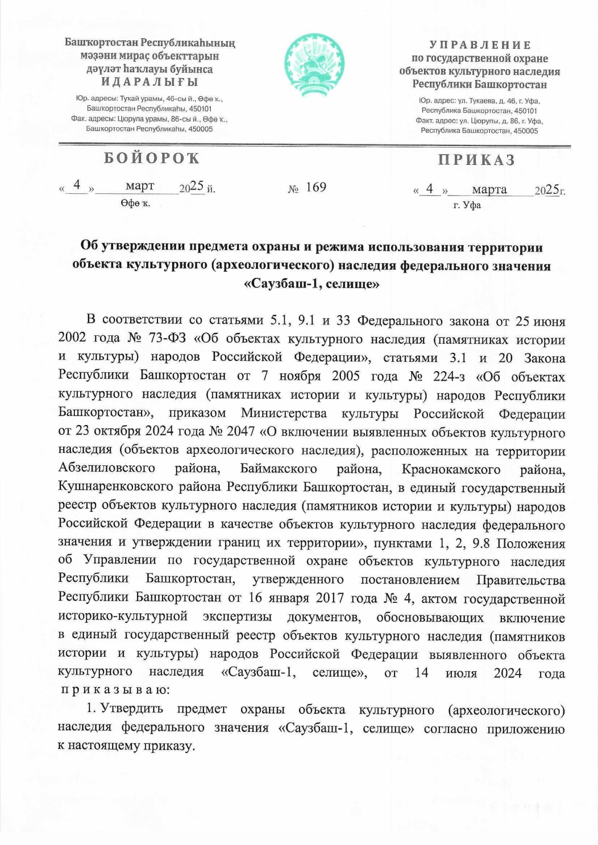 Приказ Управления по государственной охране объектов культурного наследия Республики Башкортостан от 04.03.2025 № 169