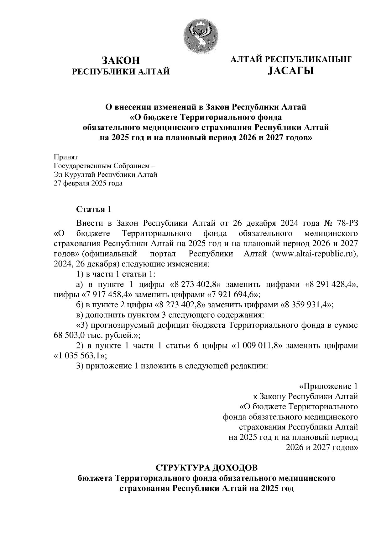 "О внесении изменений в Закон Республики Алтай "О бюджете Территориального фонда обязательного медицинского страхования Республики Алтай на 2025 год и на плановый период 2026 и 2027 годов"