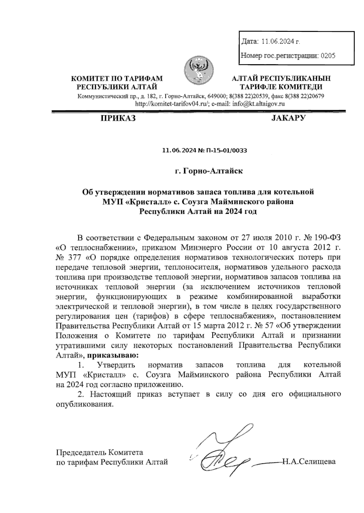 Приказ Комитета по тарифам Республики Алтай от 11.06.2024 № П-15-01/0033