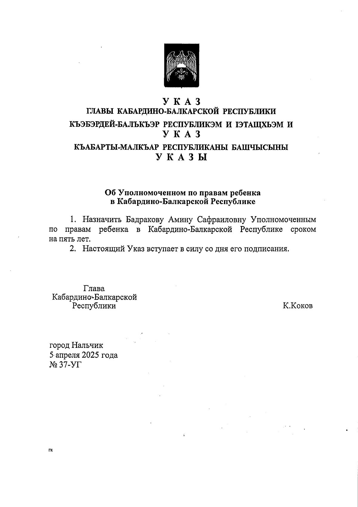 Указ Главы Кабардино-Балкарской Республики от 05.04.2025 № 37-УГ