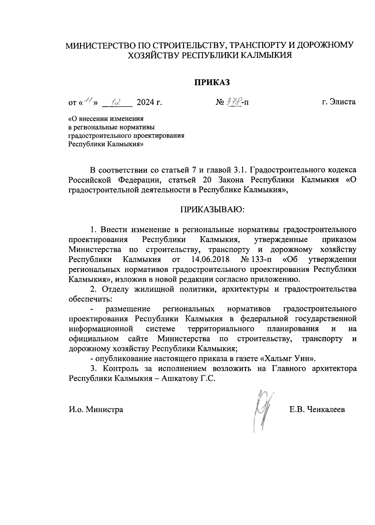 Приказ Министерства по строительству, транспорту и дорожному хозяйству Республики Калмыкия от 11.12.2024 № 378-п