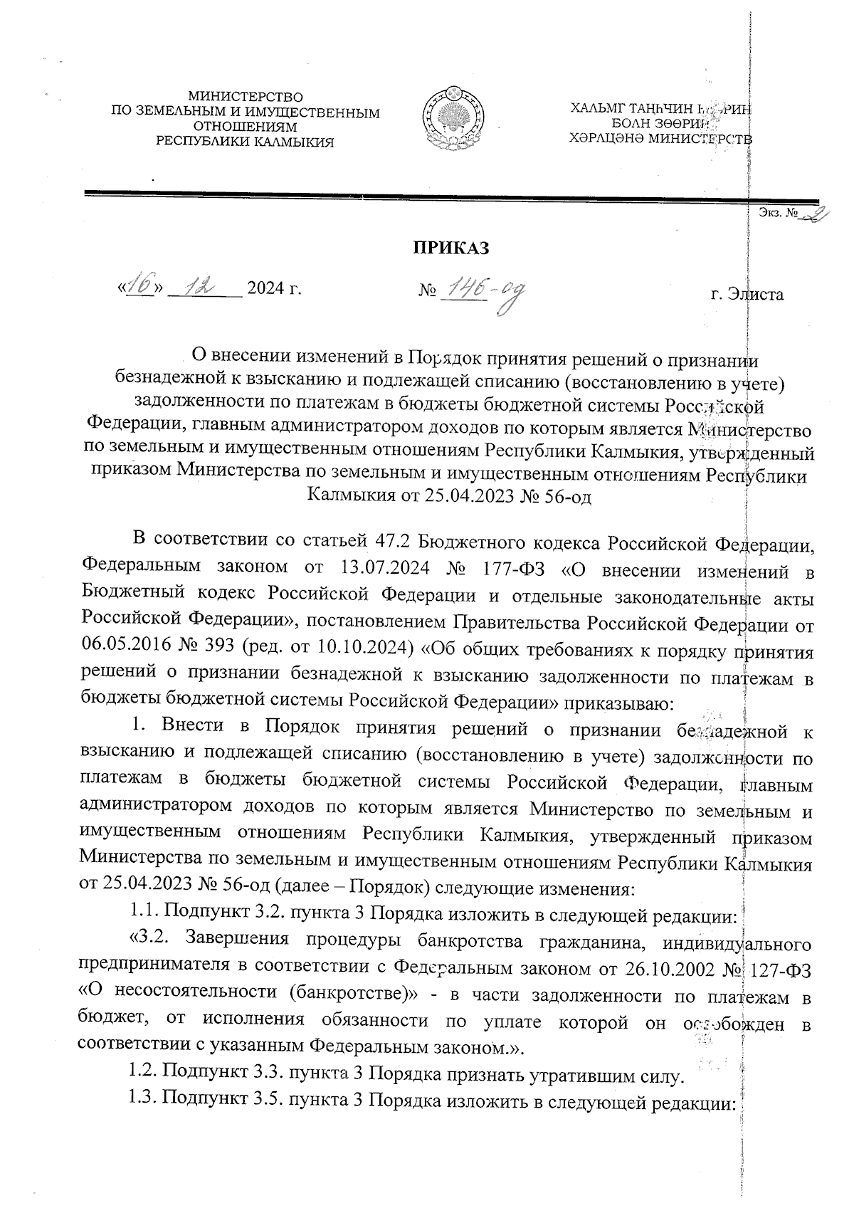 Приказ Министерства по земельным и имущественным отношениям Республики Калмыкия от 16.12.2024 № 146-од