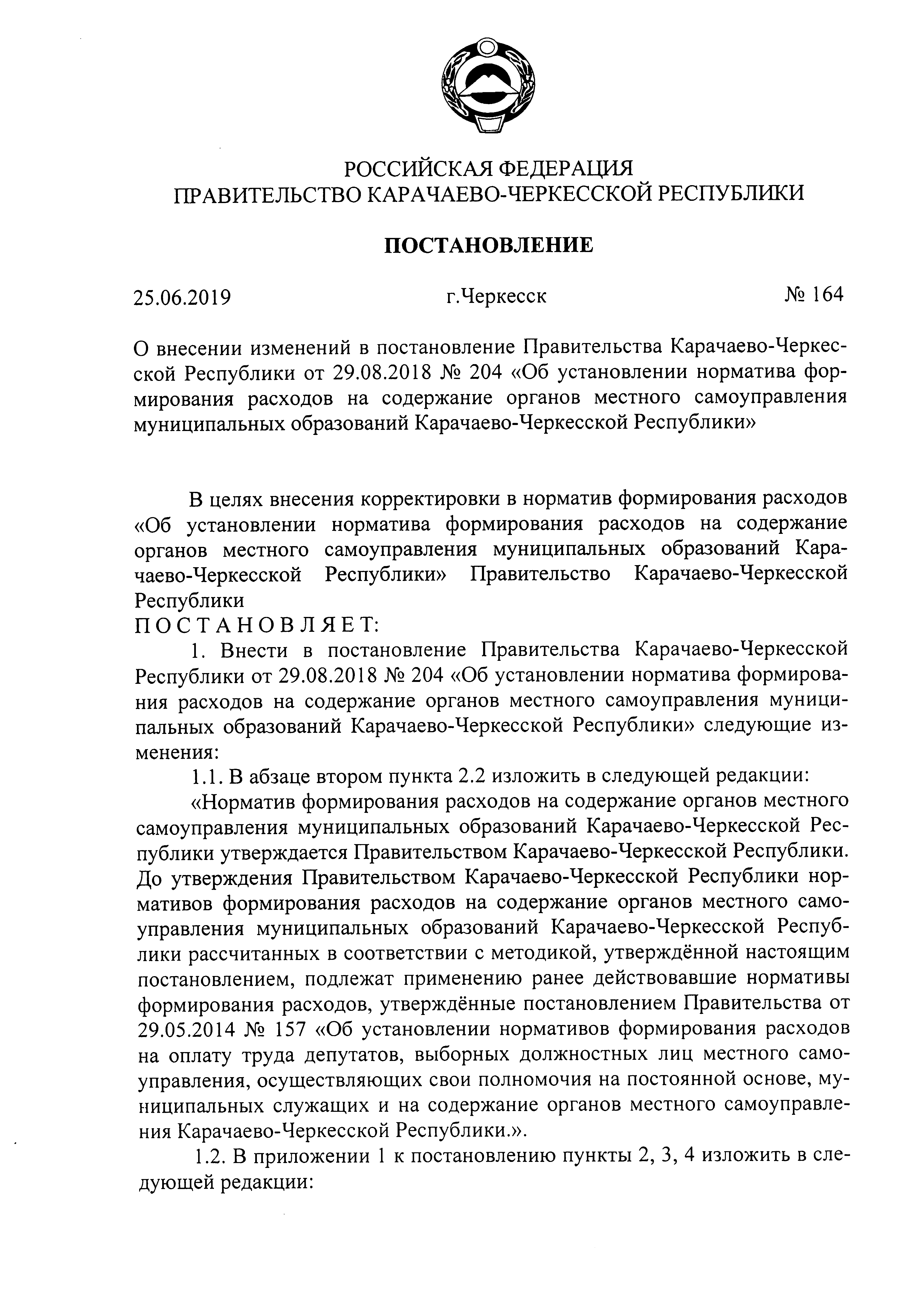 "О внесении изменений в постановление Правительства Карачаево-Черкесской Республики от 29.08.2018 № 204 "Об установлении норматива формирования расходов на содержание органов местного самоуправления муниципальных образований Карачаево-Черкесской Республики"