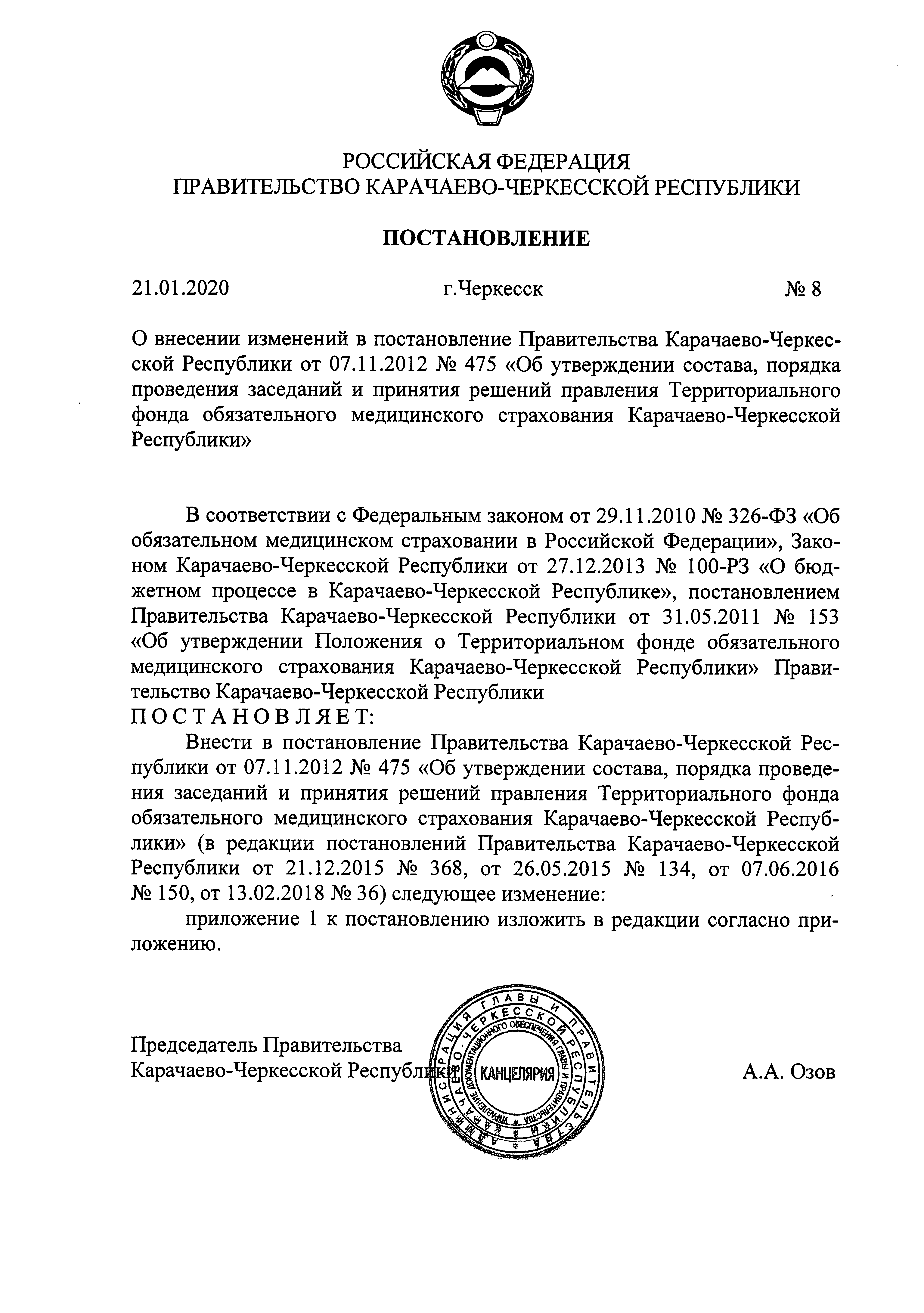 "О внесении изменений в постановление Правительства Карачаево-Черкесской Республики от 07.11.2012 № 475 "Об утверждении состава, порядка проведения заседаний и принятия решений правления Территориального фонда обязательного медицинского страхования Карачаево-Черкесской Республики"